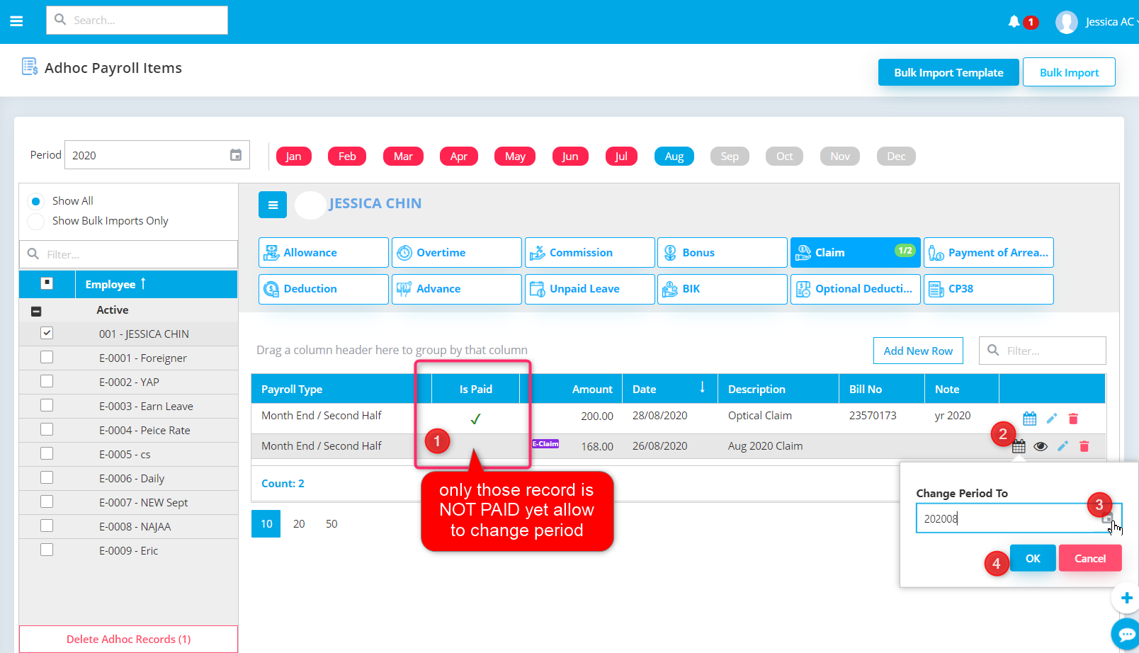 User can move previous month un-paid adhoc payroll items easily to another period without redo the whole thing. For example, user able to move all those submitted claims that had not been paid but had ran the payroll process to the following next month.
