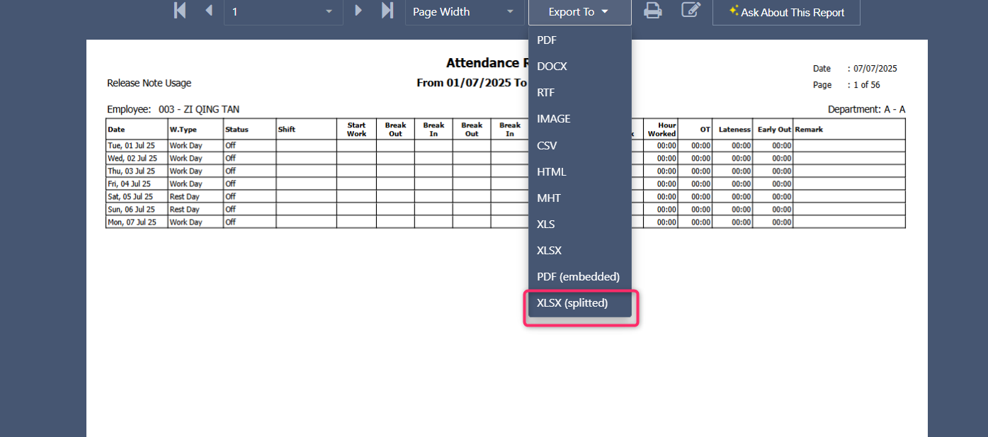 Report preview - Added new export option : XLSX (splitted). This will display one employee per sheet in excel workbook.