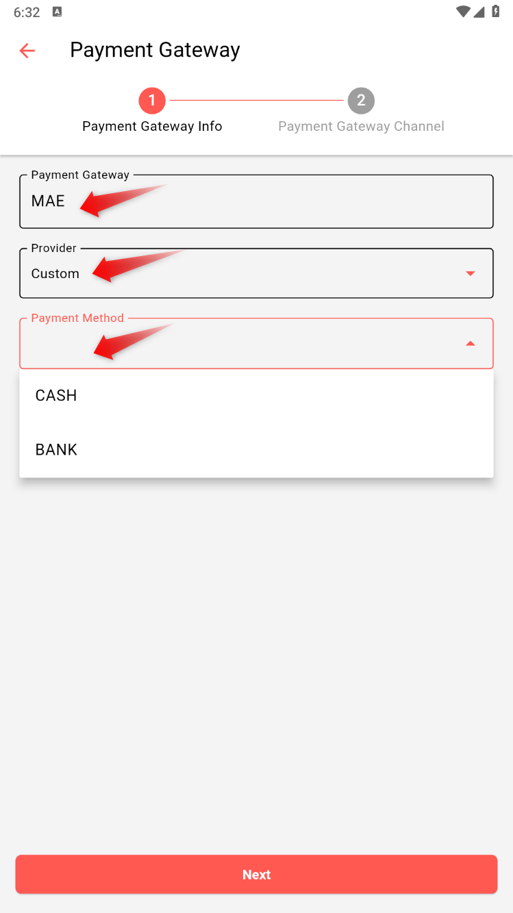 3. Name your Payment Gateway, then choose your payment gateway provider (ex: Custom, RHB, Boost & etc...), and also payment method (Cash / Bank). Click Next after done.