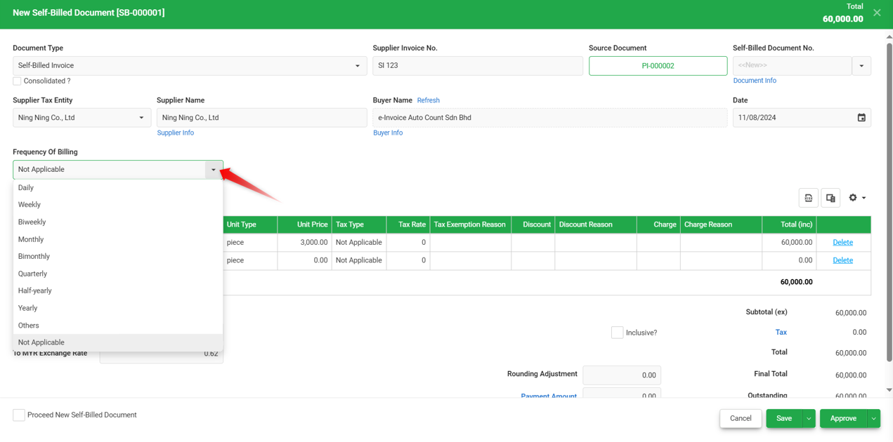 5. The information you created in Purchase Invoice will be automatically copied to this Self-Billed Invoice.