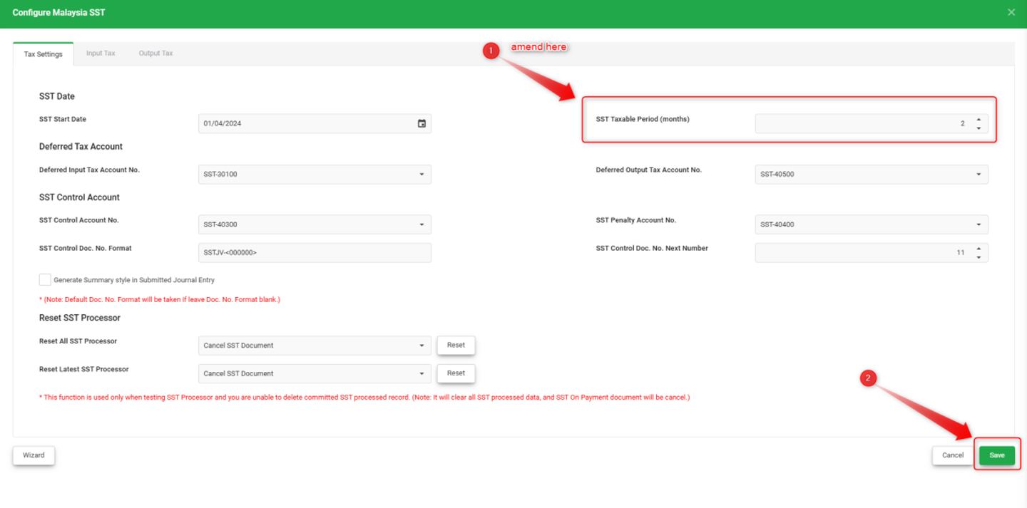 SST Taxable Period (months) is located on the top right, may proceed to amend and click on Save.