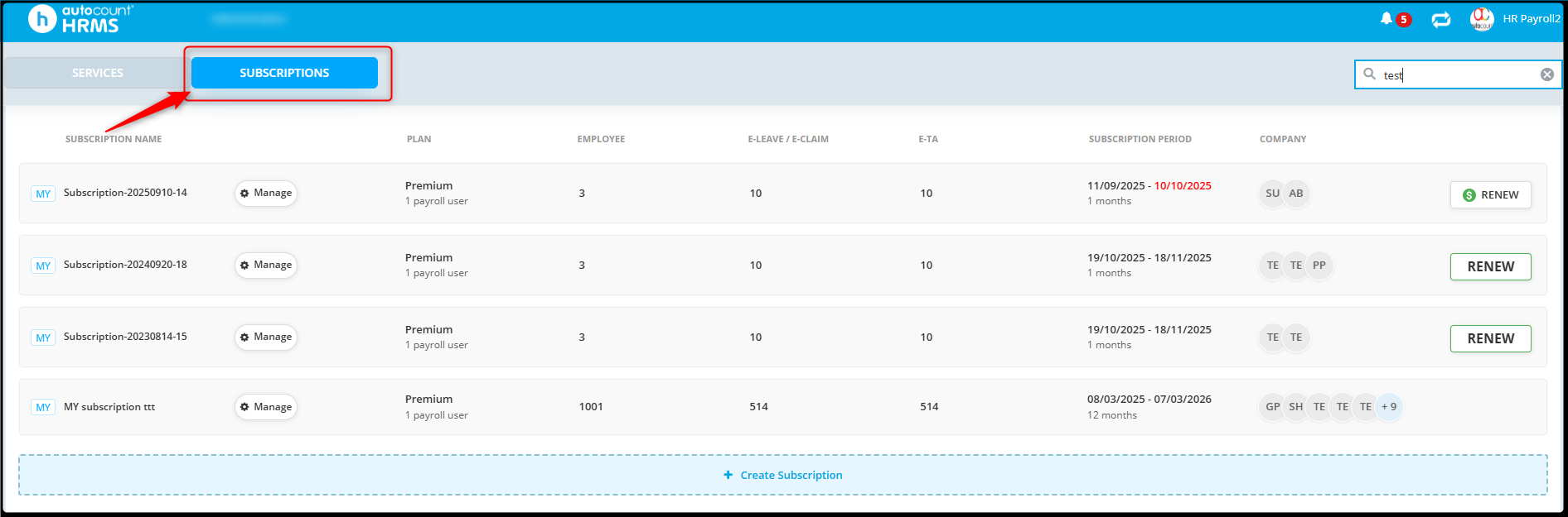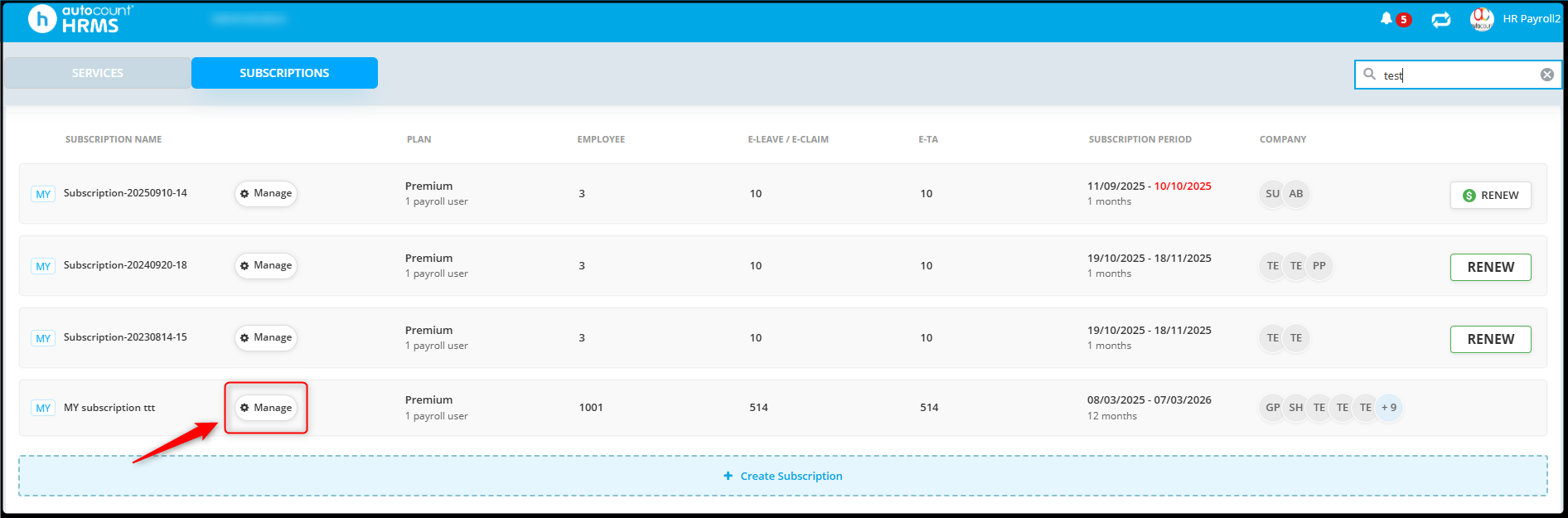 - Find the subscription you want to change the billing day, then click the Manage button next to it.