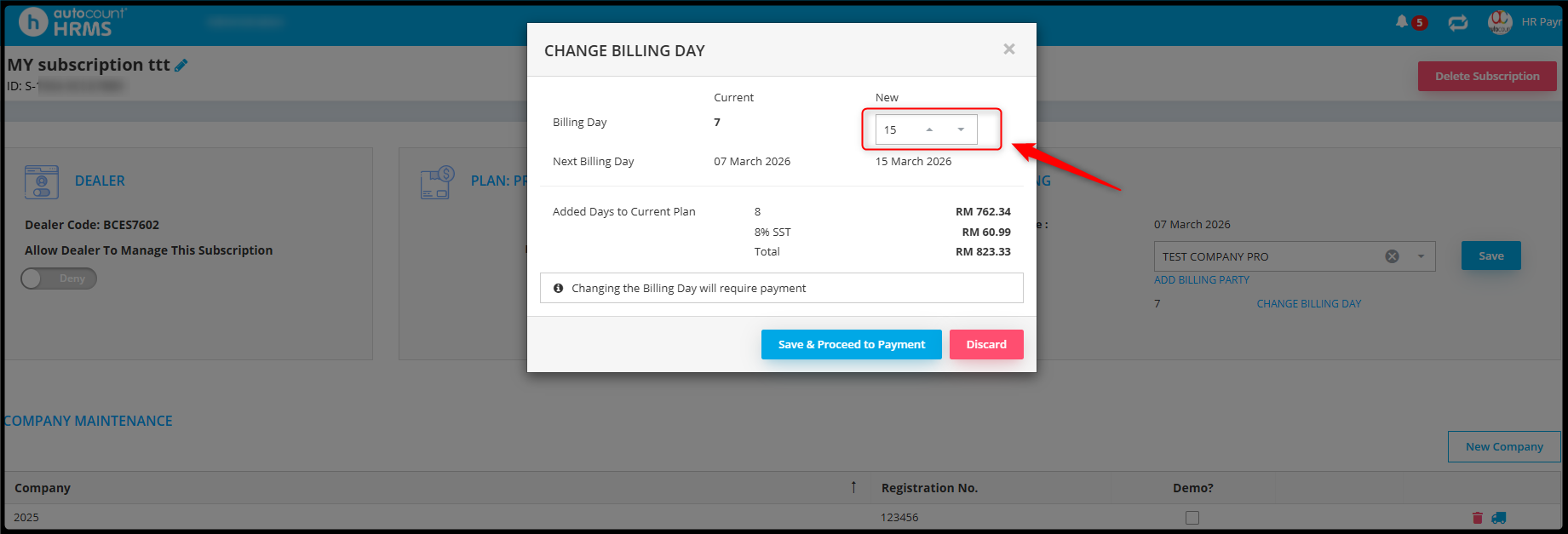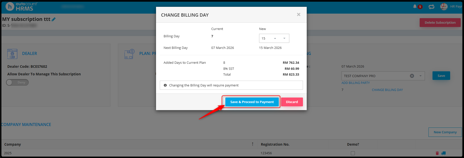 - The system will calculate and display any additional fee based on the new billing day. Once confirmed, click Save & Proceed to Payment.
