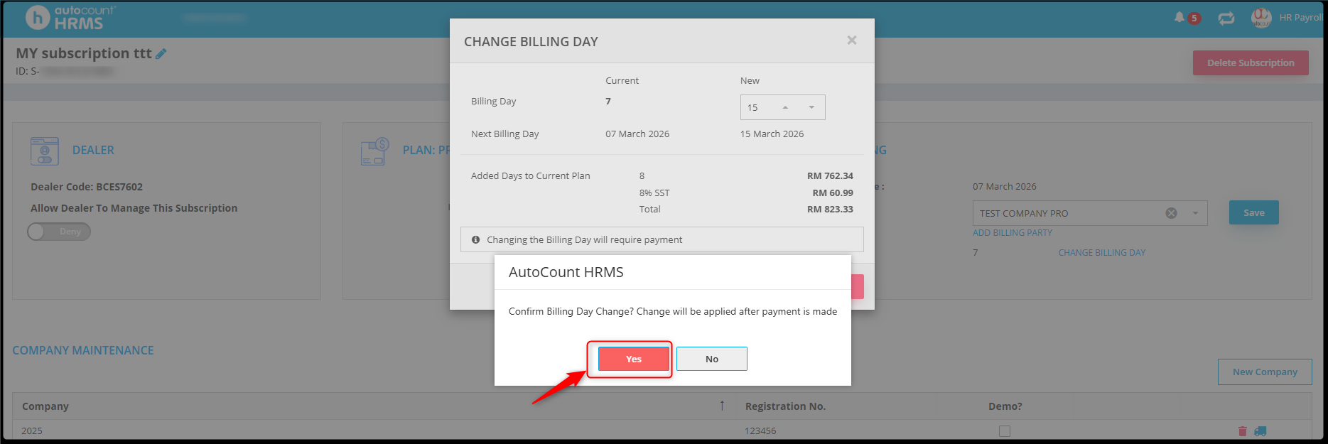 - Click Yes to confirm. The system will be redirected to the payment page, and once the payment is completed, the billing day will be successfully updated.