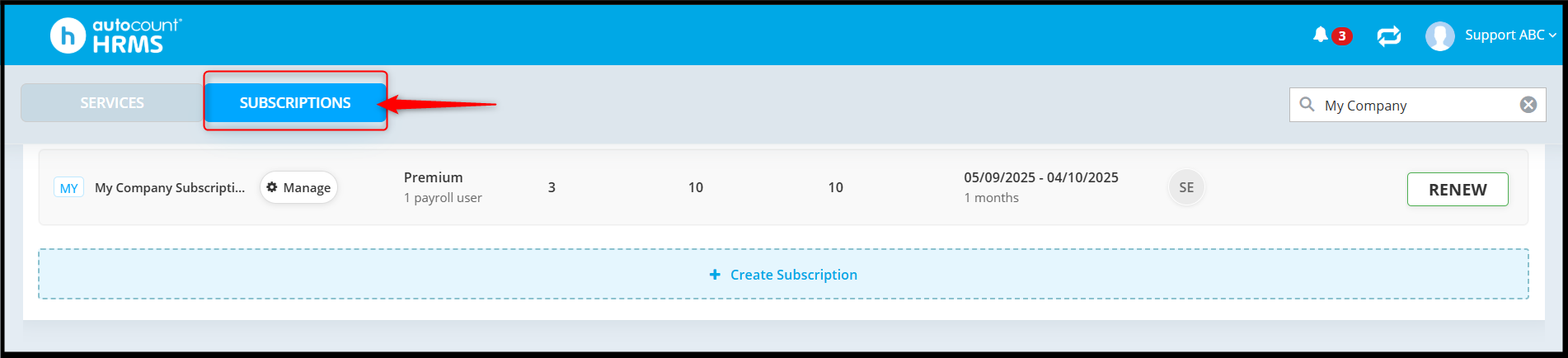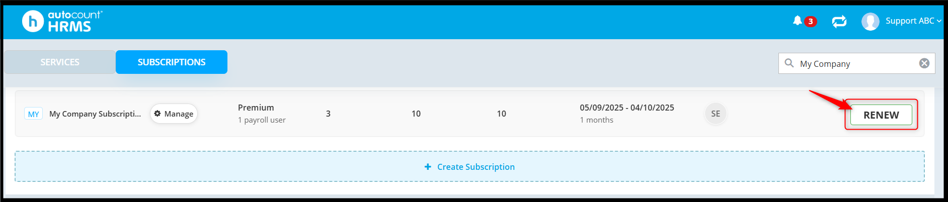 2. In the Subscription page, identify the subscription that you wish to renew and click Renew.