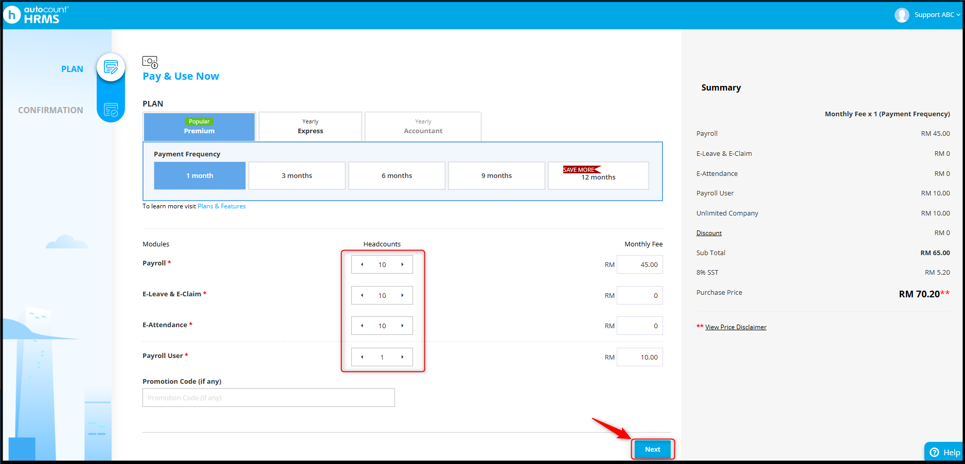 4. You will be redirected to a new page where you can configure the number of headcounts for each modules. Enter the required values accordingly and click Next.