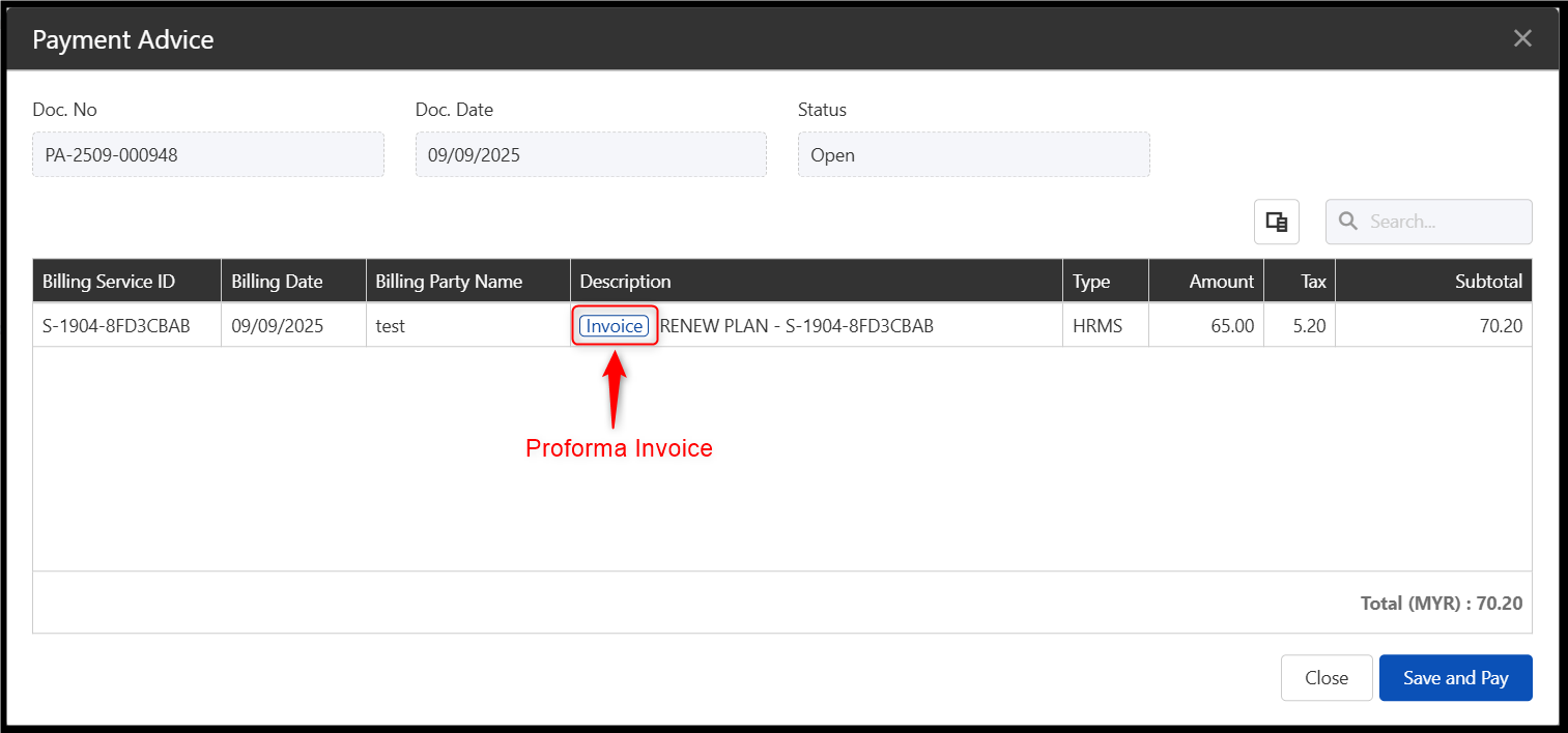 7. You will be redirected to the Subscription Portal, where you can preview the invoice (also known as the proforma invoice) before making the payment. If you wish to proceed, click on Save and Pay.