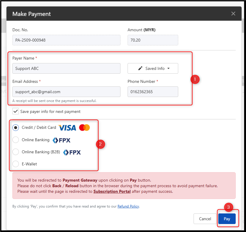 8. From this page, make sure the payer detail is correct. Then, select your preferred payment method. After making your selection, click Pay to complete the payment process.