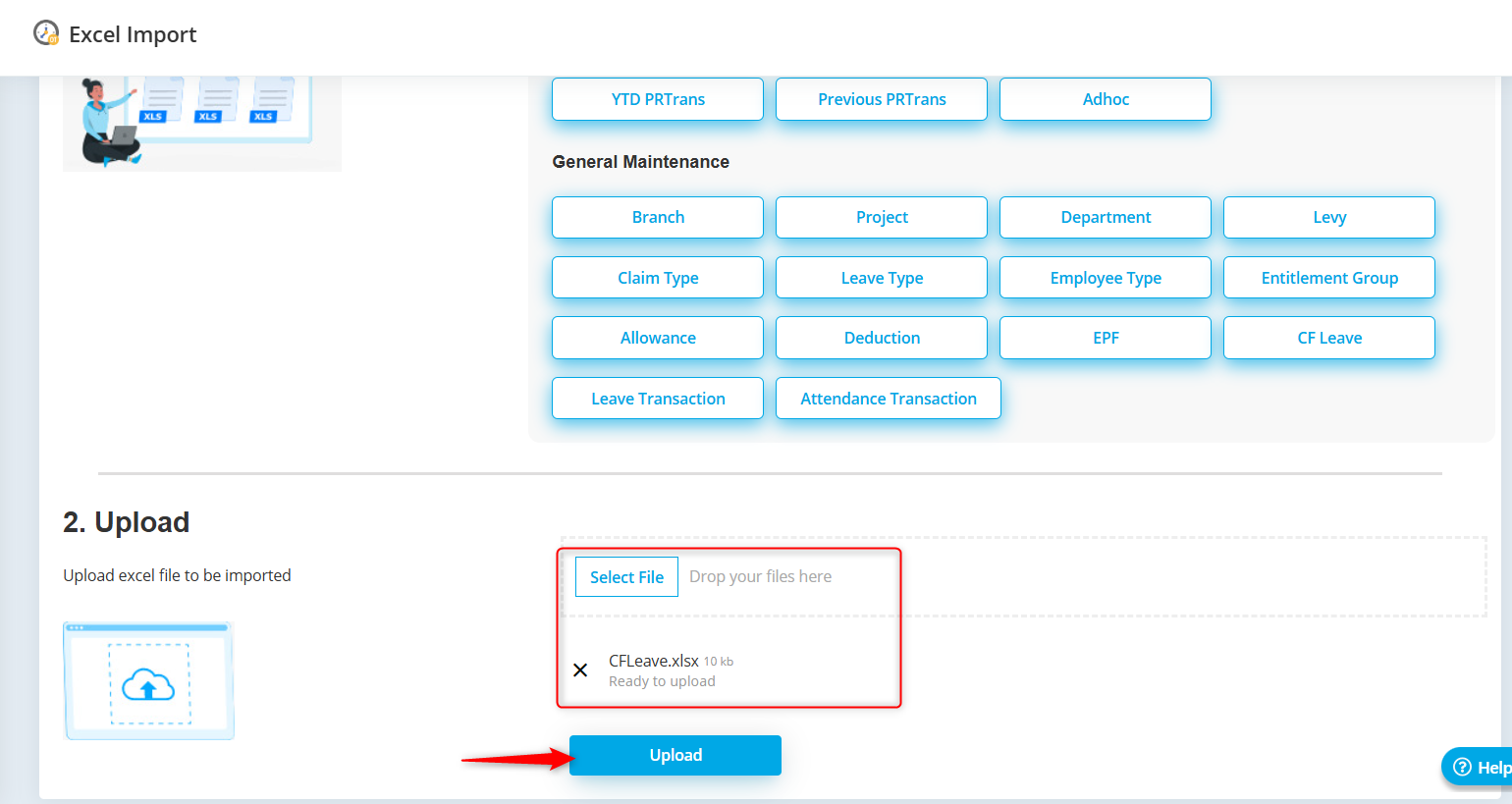 Head back to AutoCount HRMS Excel Import page, upload the file that was edited and click on the Upload button.