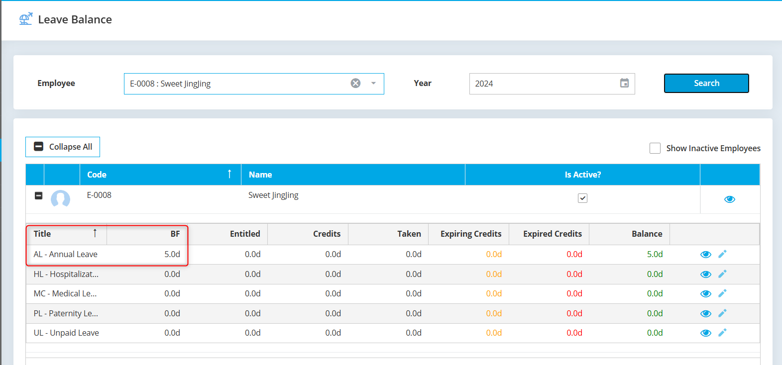 Fill in the necessary information such as Employee Code, Leave Type Code, Year (The year you would like this CF Leave to appear), CF Days and save once you’re done.