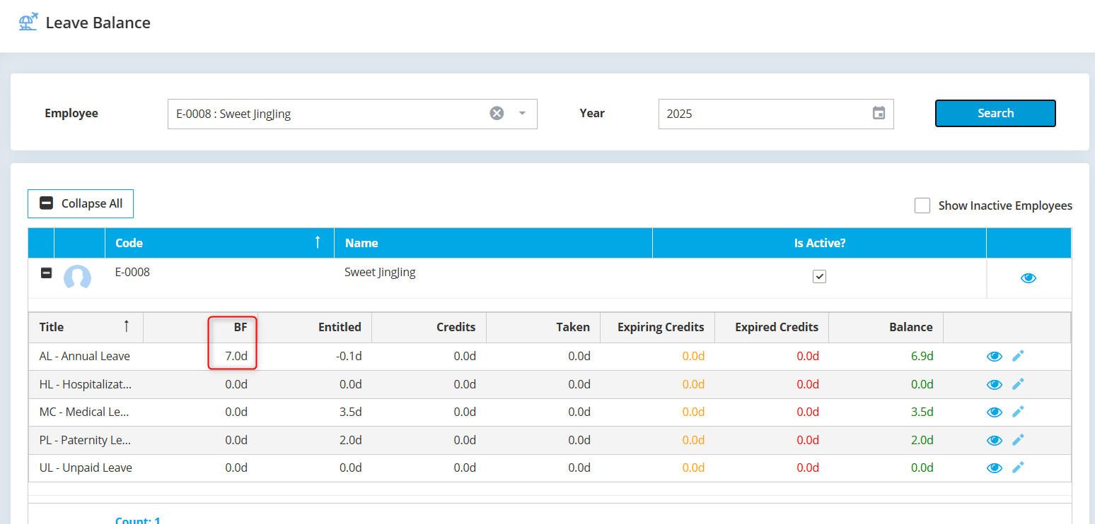 You can check if the leave has been successfully carried forward by going to Human Resources > Leave Balance under Leave Management then identify the employee and click on Search.
