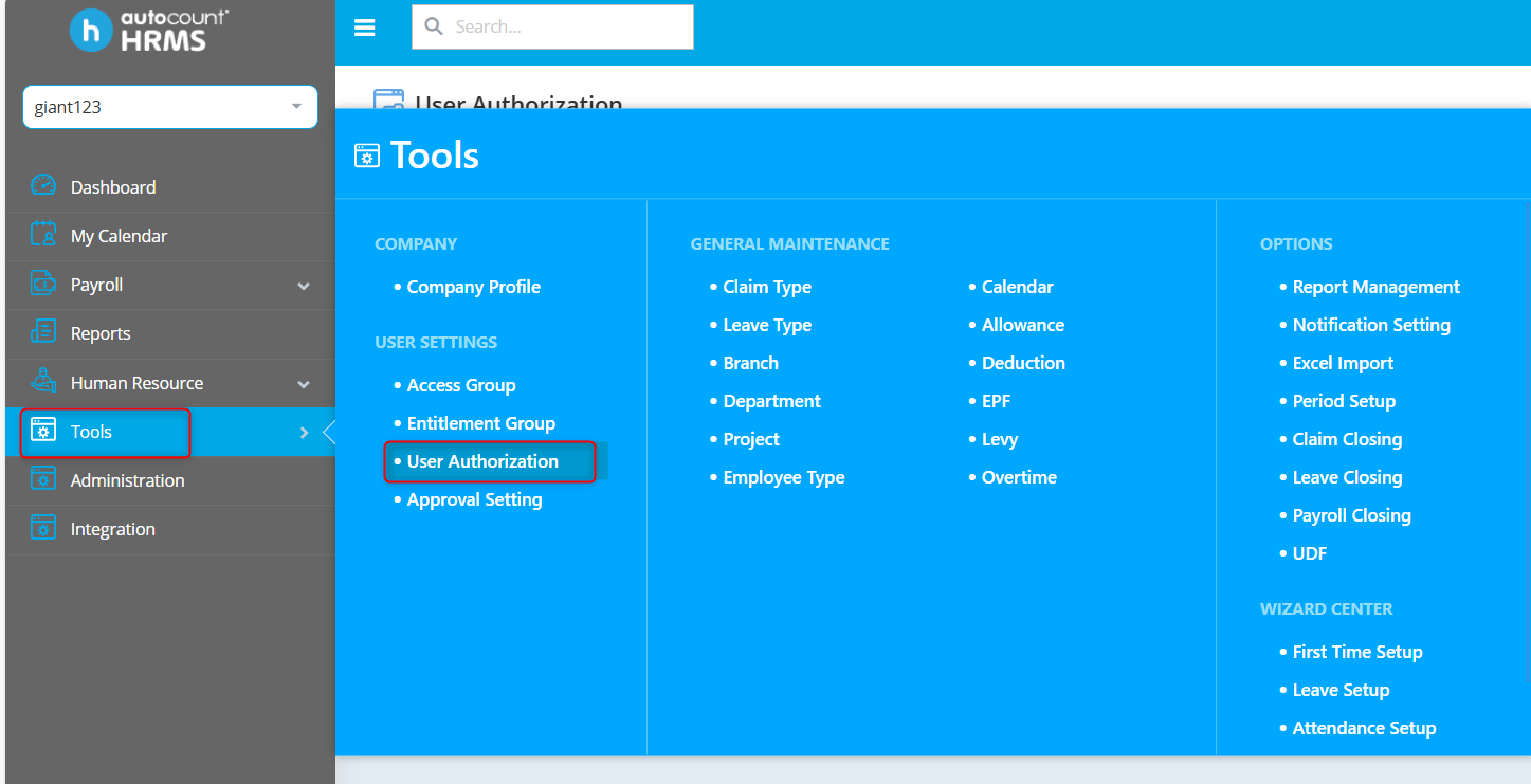 To be able to view your employee on My Calendar you must first ensure that you have maintained a proper setting, to do so, go to Tools and User Authorization under User Settings.