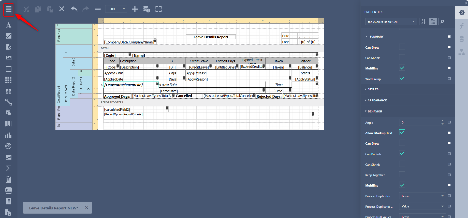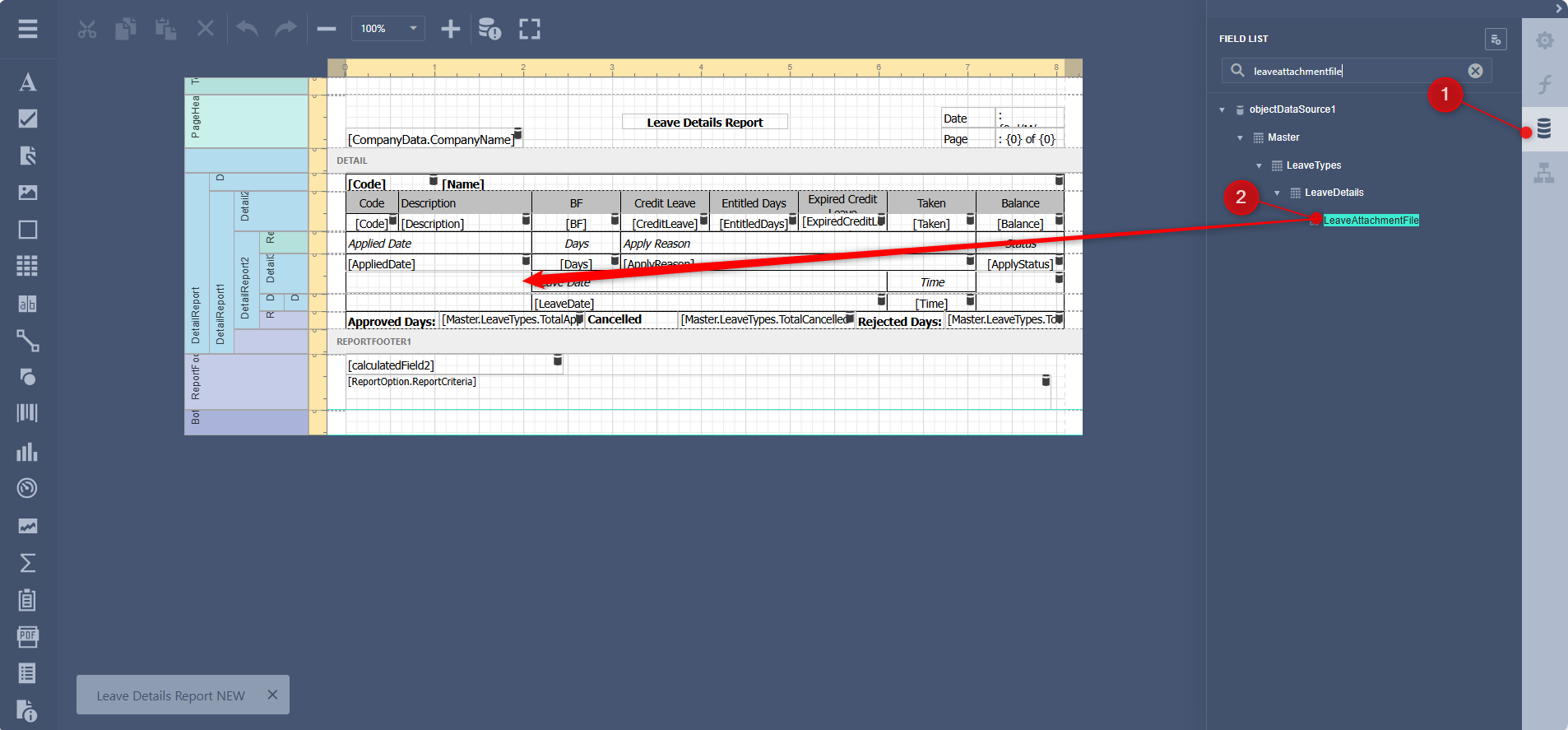 Click on the field on the right panel and search for LeaveAttachmentFile and click and drag and drop the LeaveAttachmentFile under LeaveDetails to the desired location of the report.