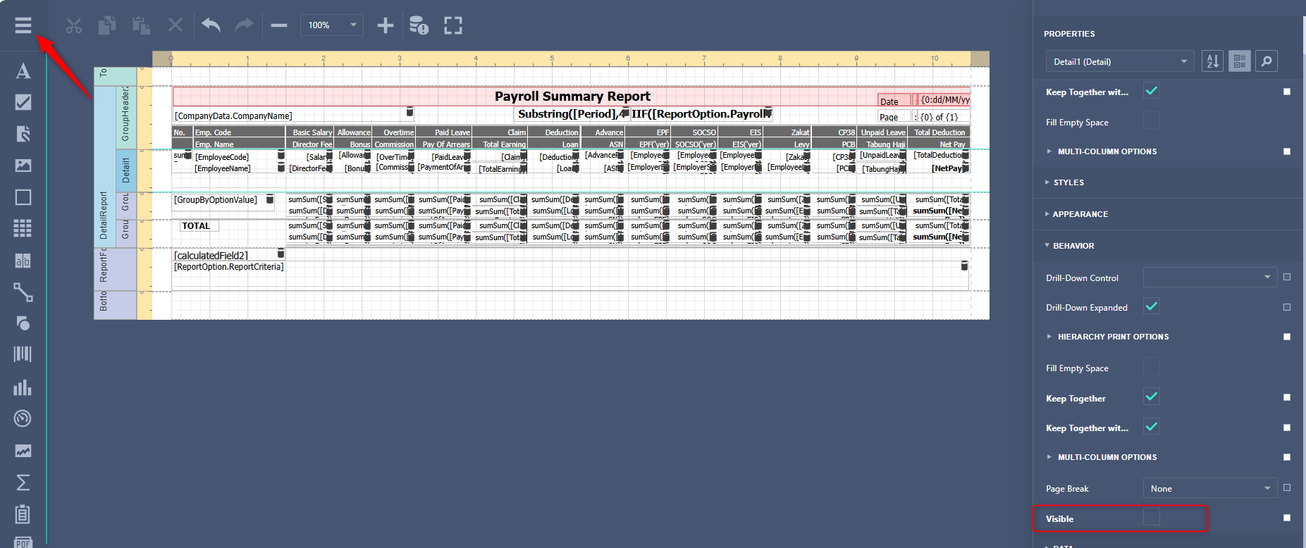 Select the Detail1 (Detail) table row in the middle of the report, select Behavior and it should expand to more options, untick the checkbox Visible.