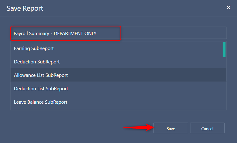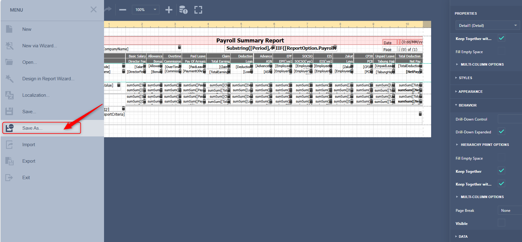 Click on Save As and enter a unique name for the newly designed report and click Save.