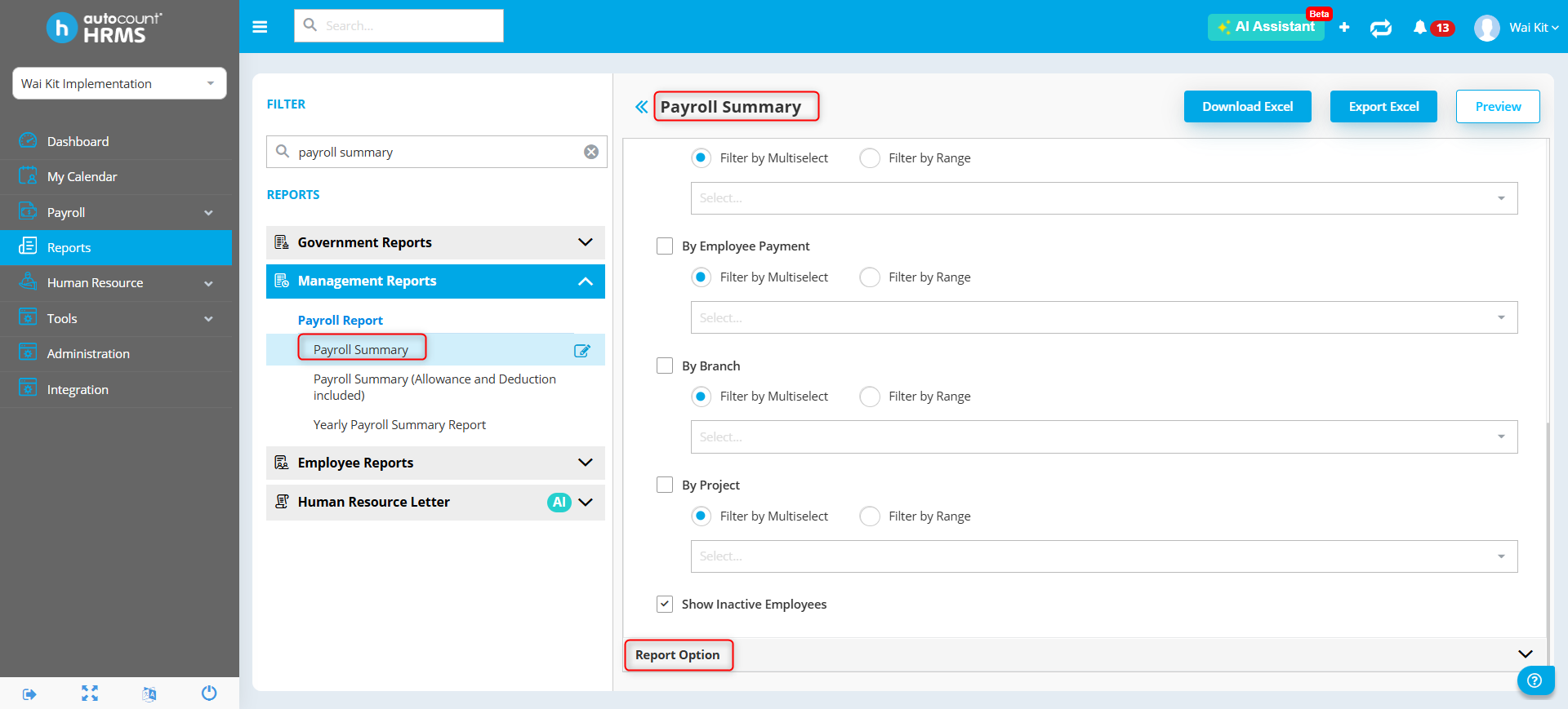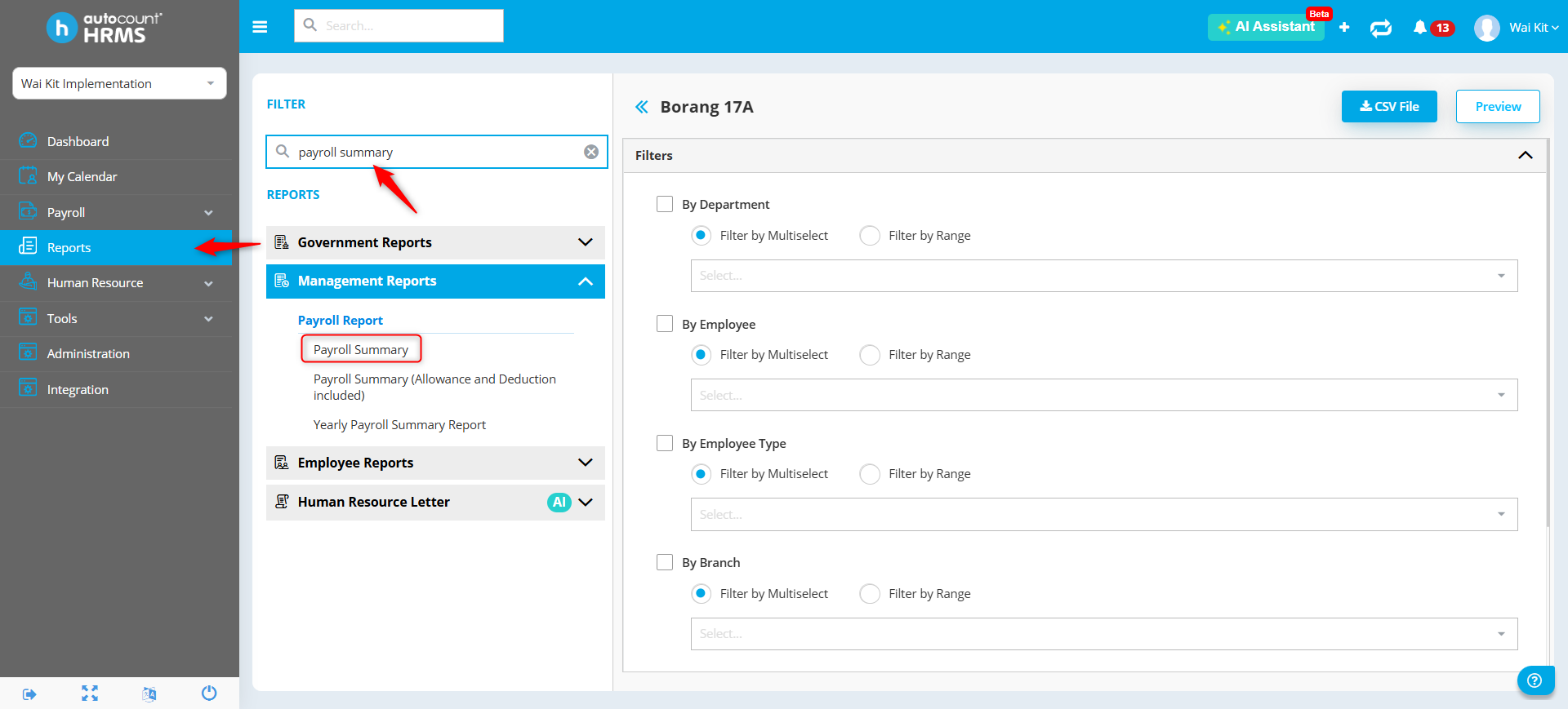 To preview the Payroll Summary Report that is grouped by either Department / Branch, you may head to Reports and search for Payroll Summary Report.