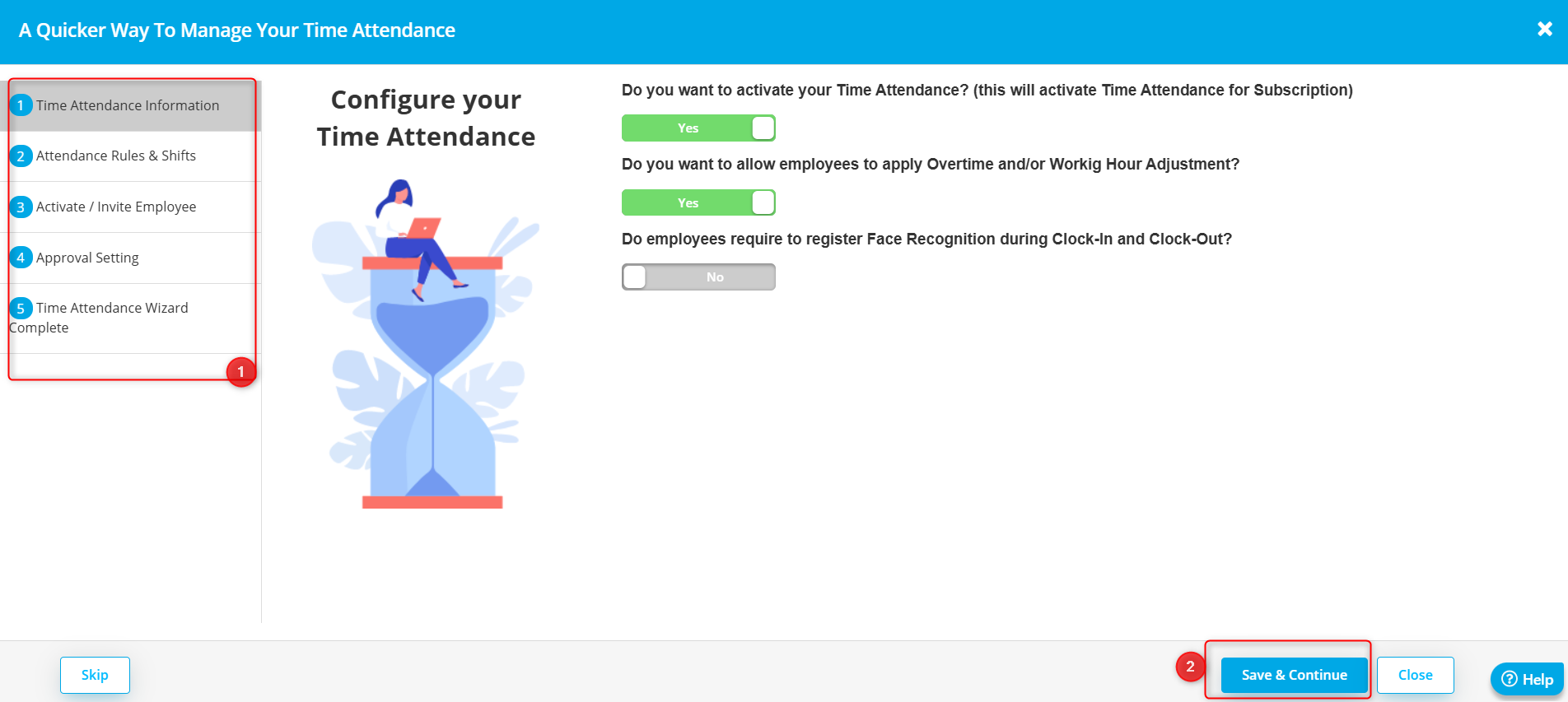 2) Ensure all required items are completed according to the wizard's instructions to efficiently manage time attendance. Click Save & Continue to proceed through each step until the end of the wizard.