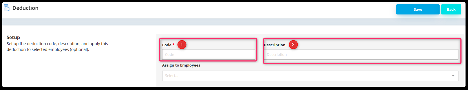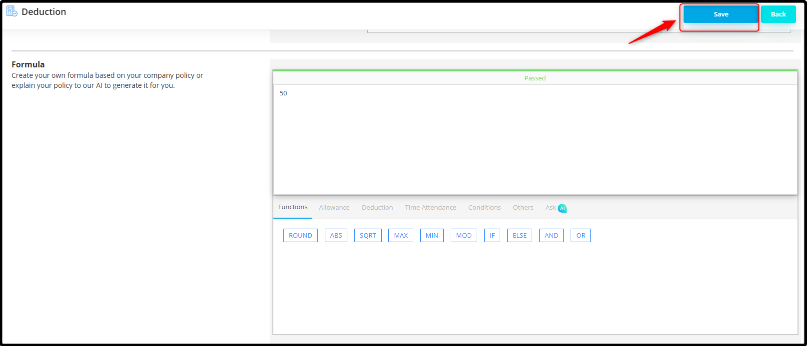 6. Once all setup details are completed, click Save at the top-right corner of the page to save the new deduction.