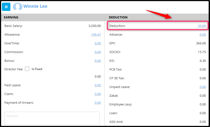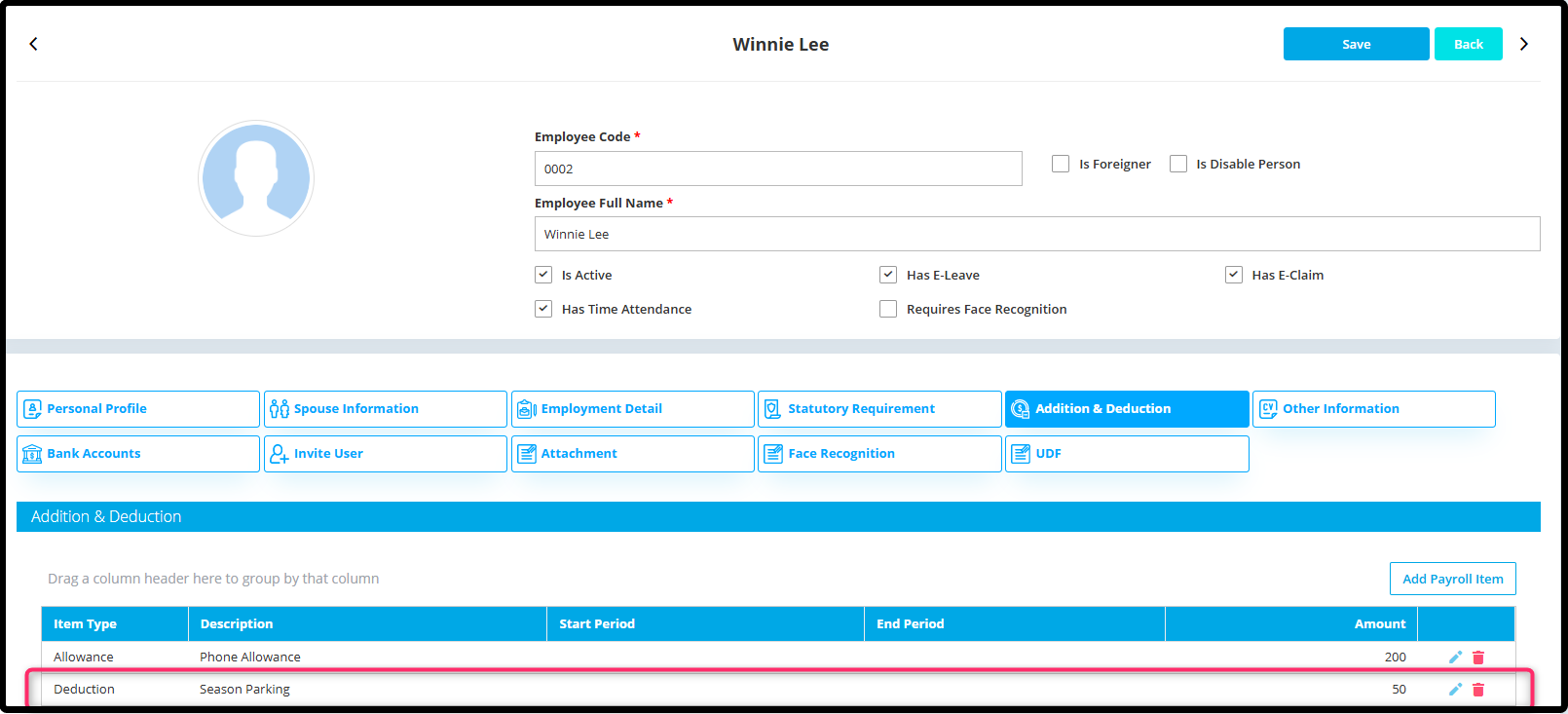 This deduction will then appear under the Addition & Deduction section in the employee profile.
