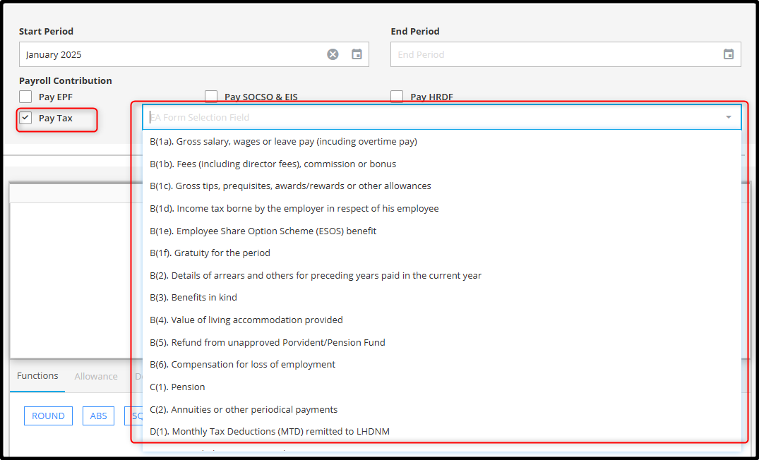 b. Tick the relevant statutory contribution checkboxes (e.g., EPF, SOCSO & EIS, HRDF, Tax).