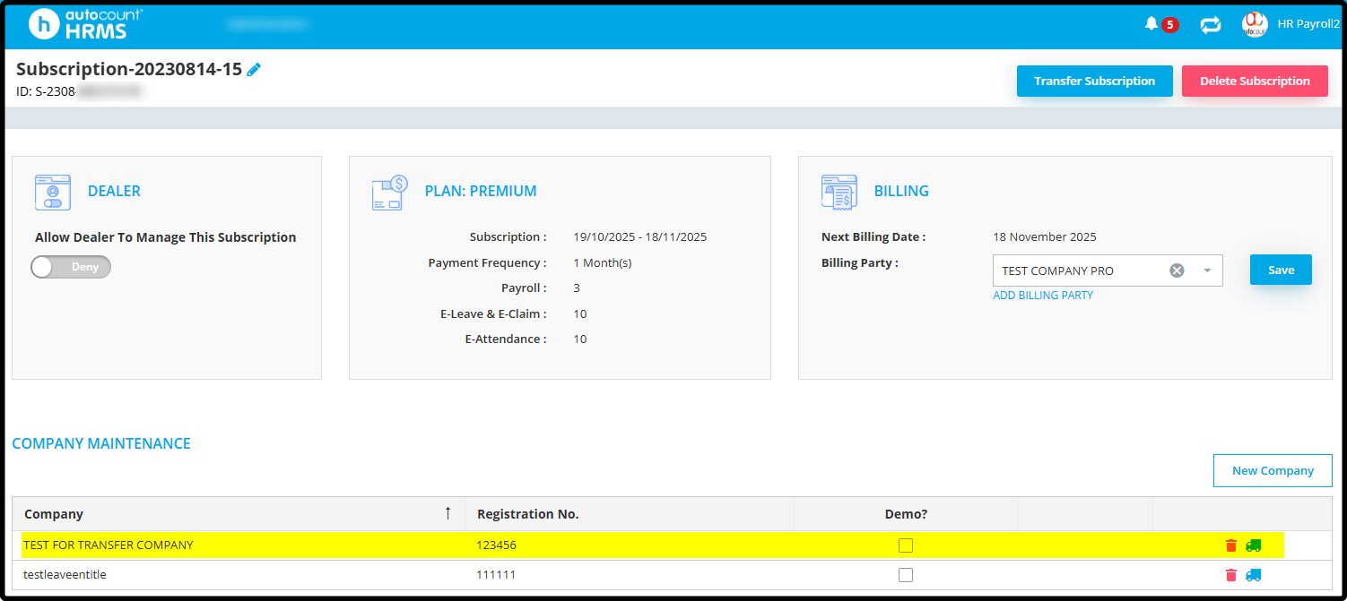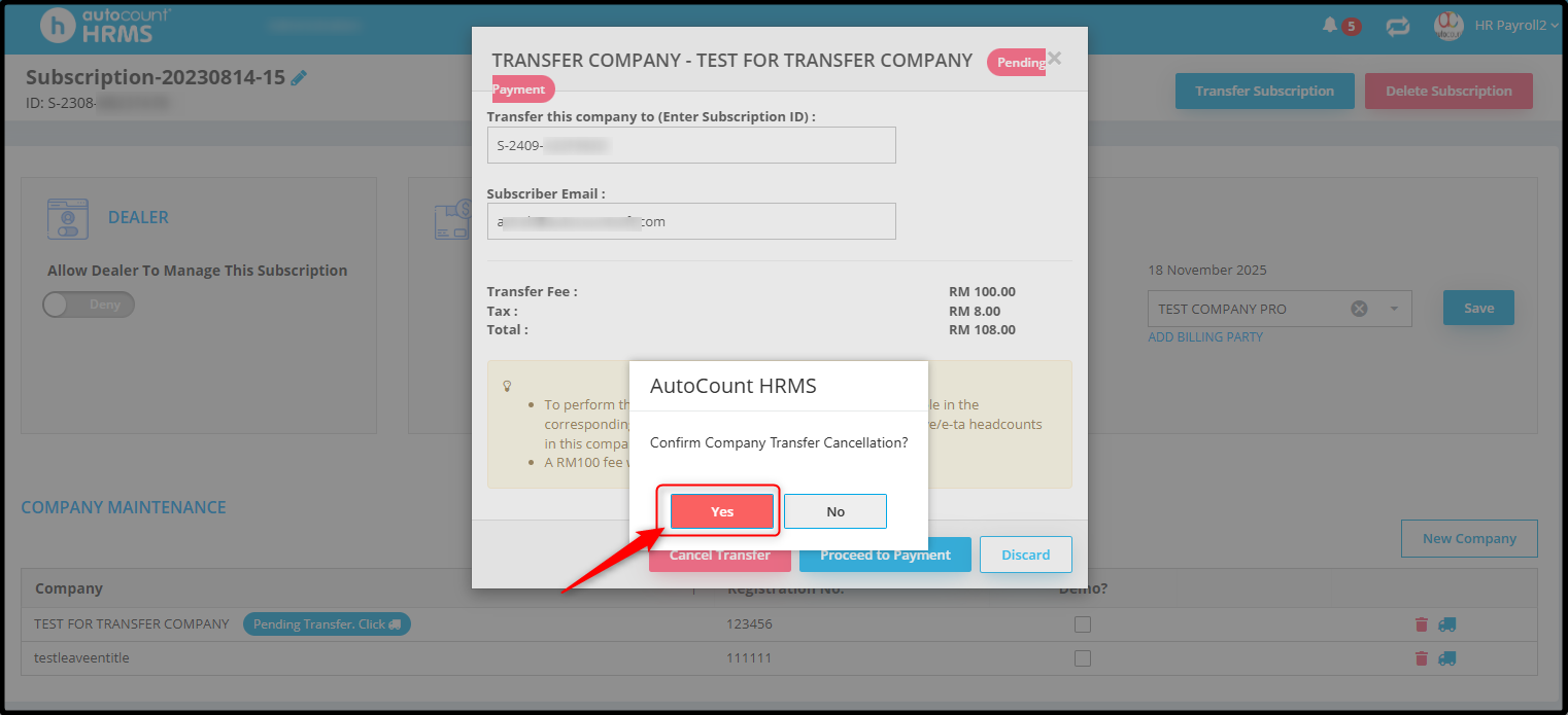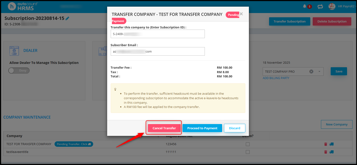 5. In the Transfer Company window, click on "Cancel Transfer".