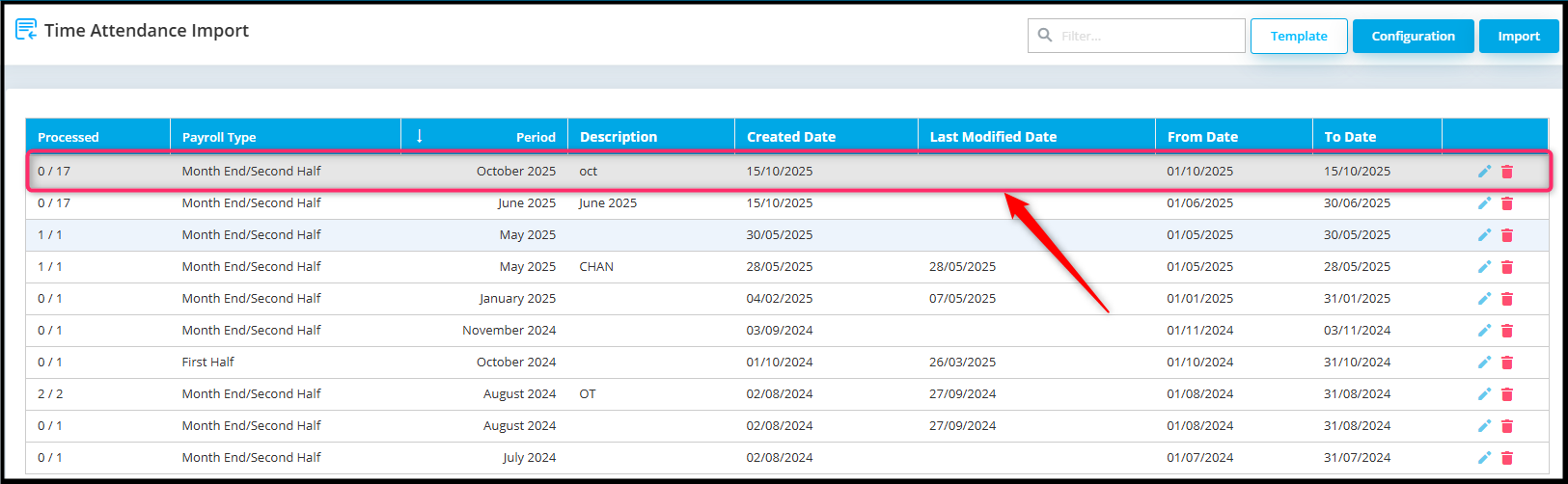 Once the Time Attendance (TA) data is imported, the clocking records under Human Resource > Attendance Transaction become locked and cannot be edited.