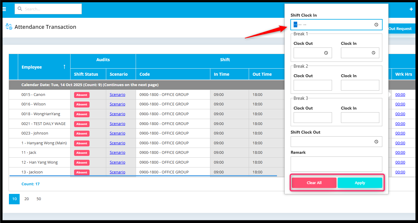 Note: If you need to adjust past attendance transactions, please refer to the article: “Amend Clock Transaction”.