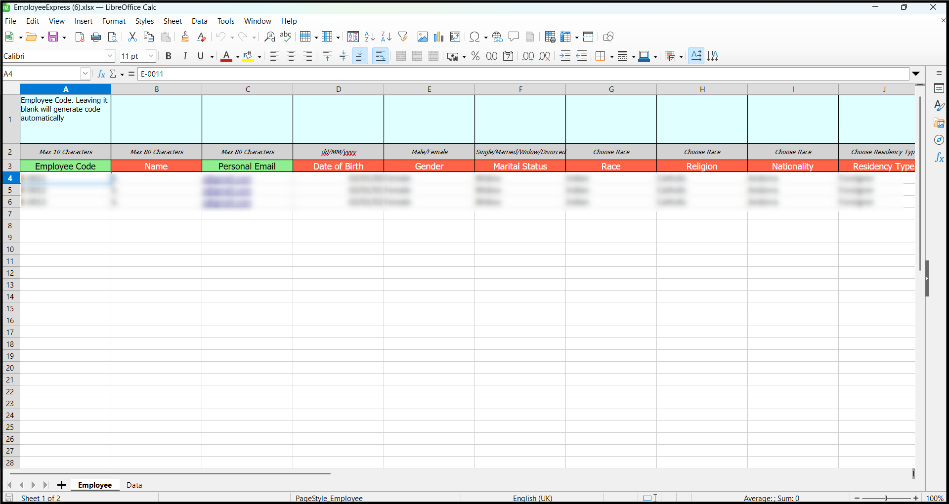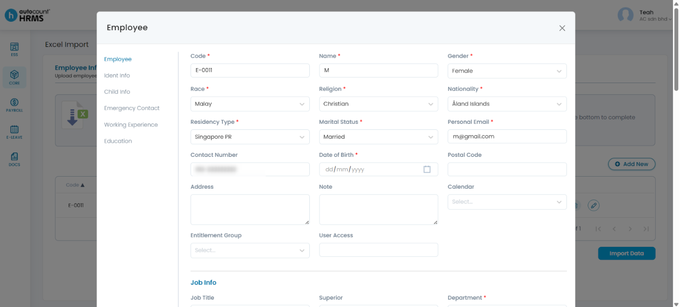 - Employee – Upload all employee details. This template contains six worksheets: Employee, Identification Info, Child Info, Emergency Contact, Working Experience and Education.