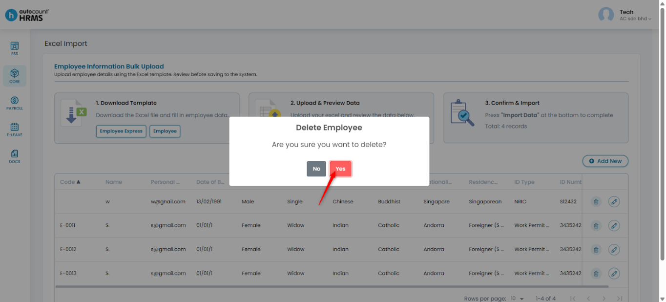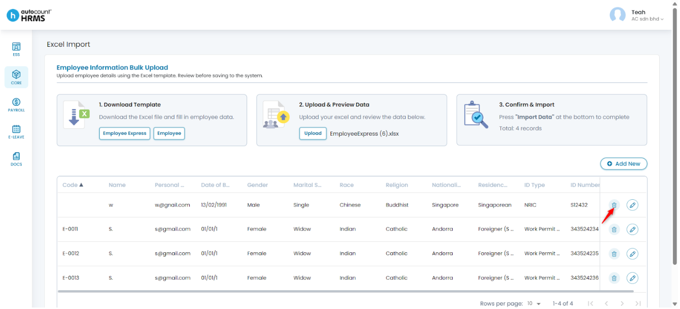 Steps to Delete an Employee Record before Importing: