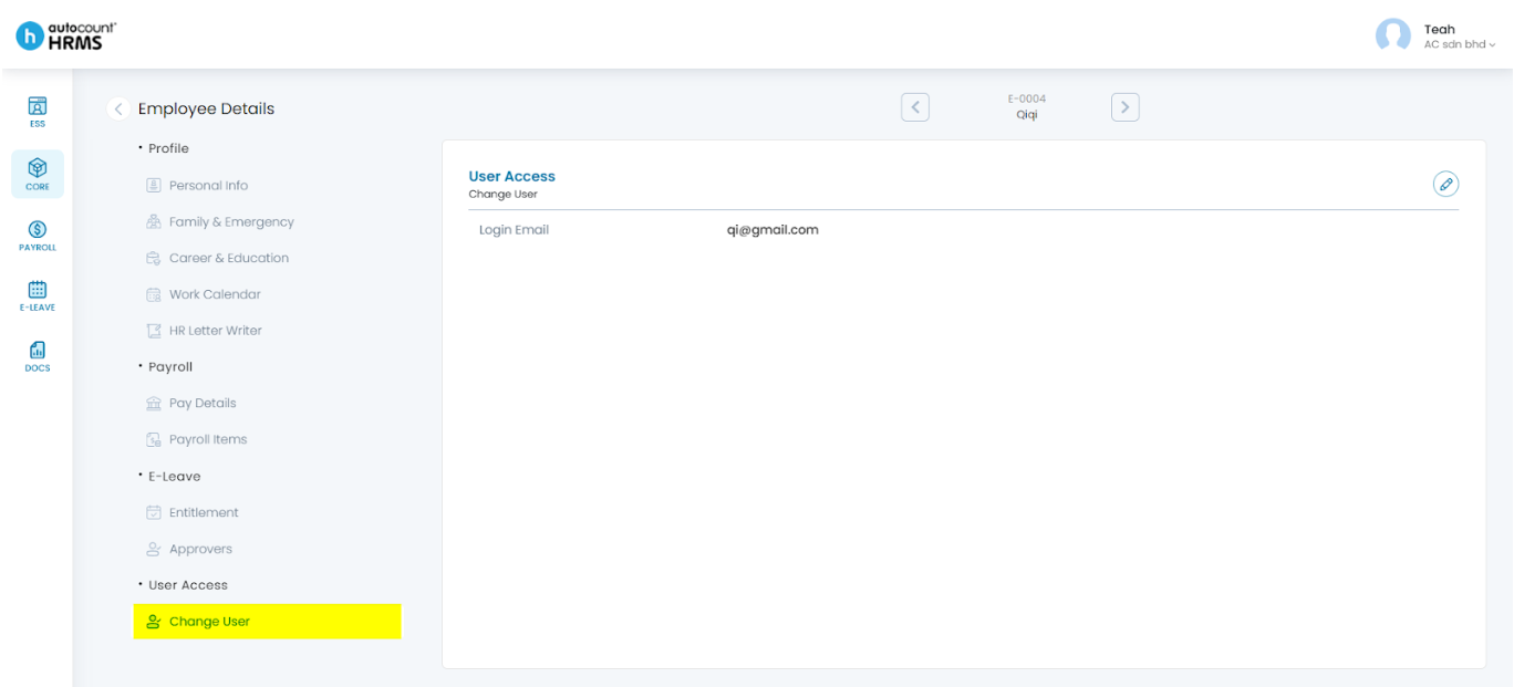 If an employee’s email address changes, or if the company assigns a new email address, you can update the email address in Employee details > User Access > Change User.