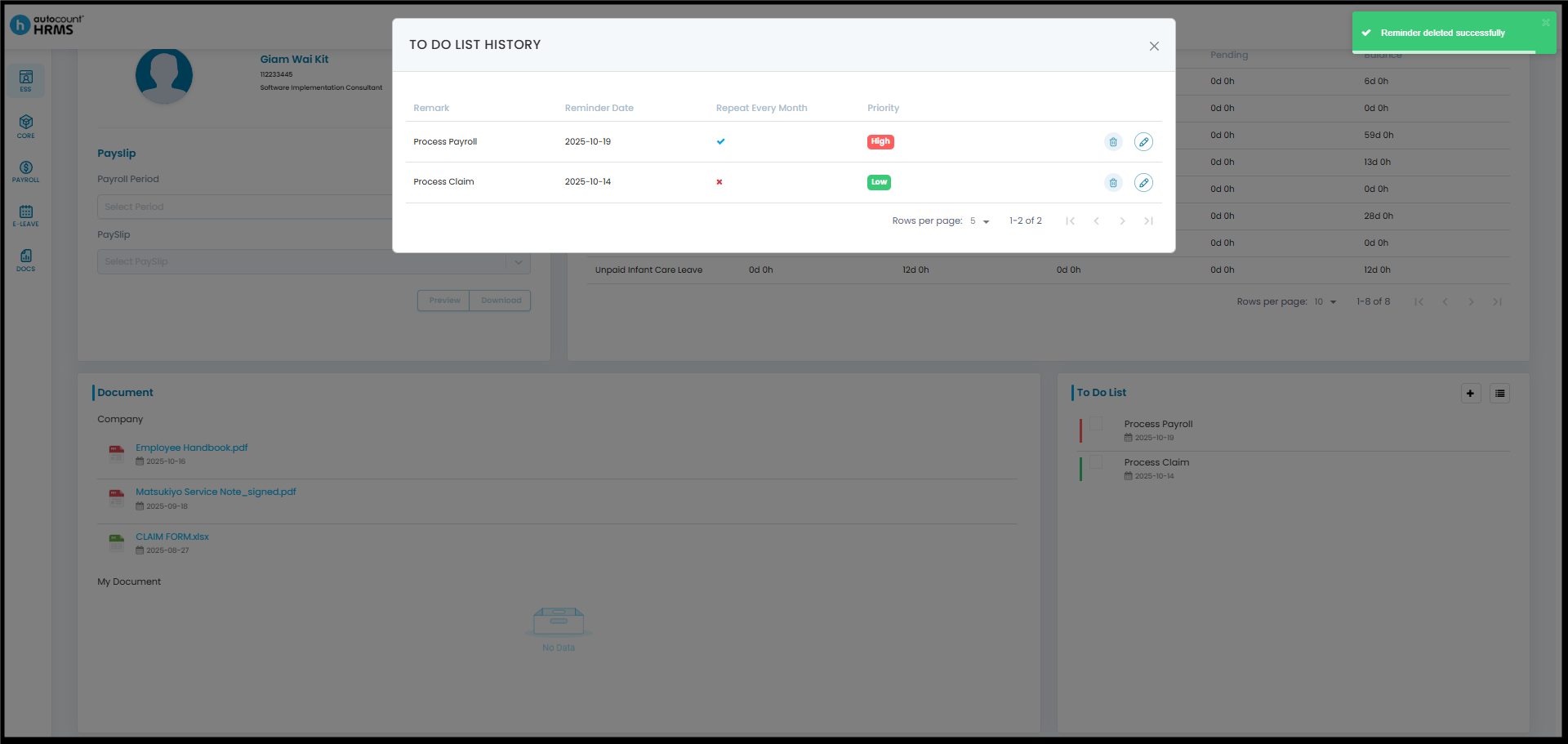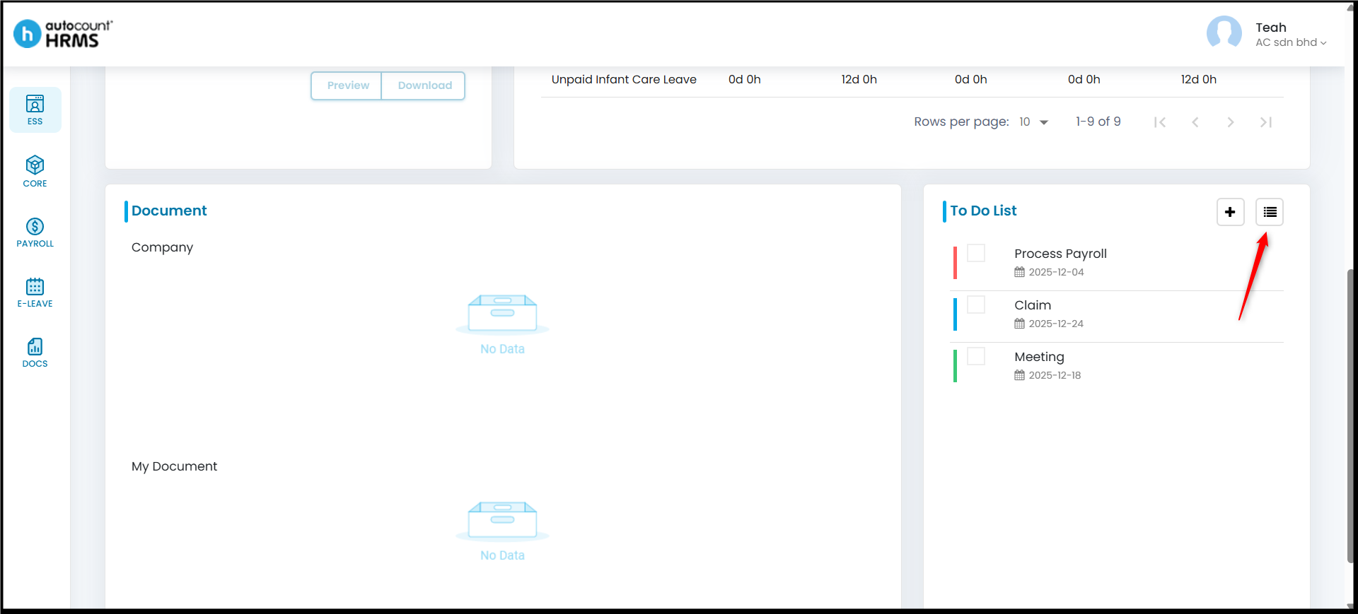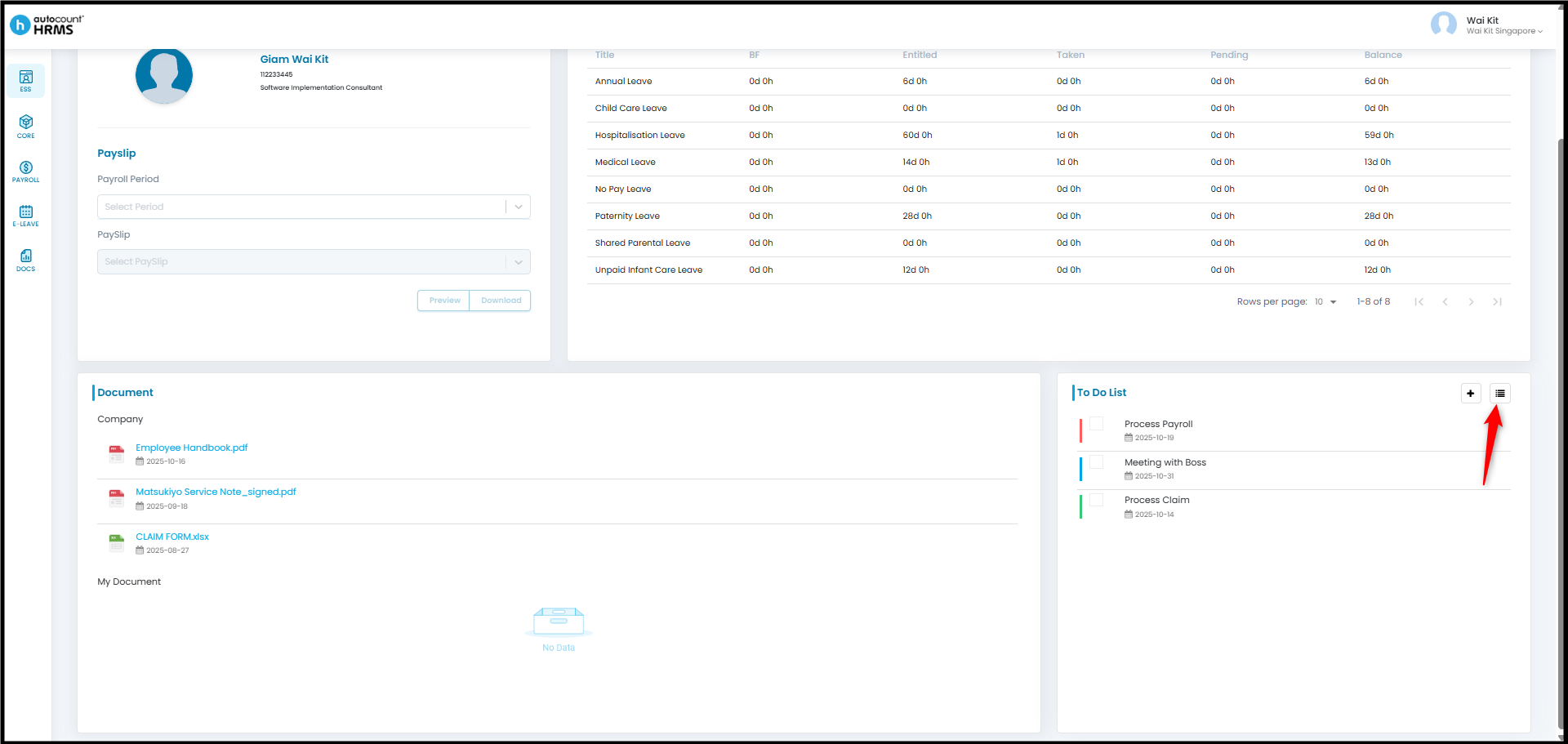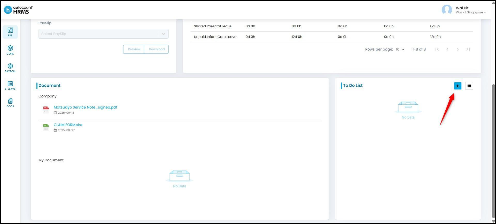 The ESS (Employee Self-Service) dashboard allows employees to create and manage their personal To-Do List, helping them stay organised and keep track of important tasks. In addition to managing to-dos, employees can also access their payslips and view their leave information.
