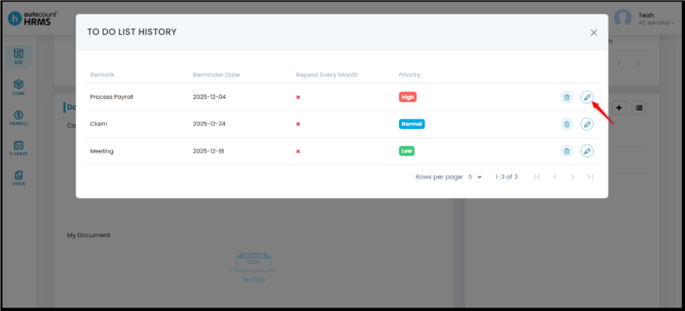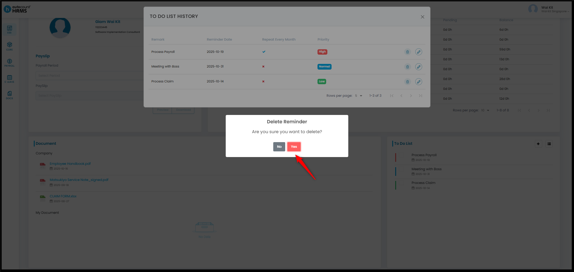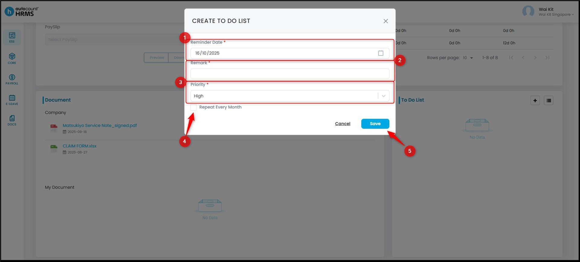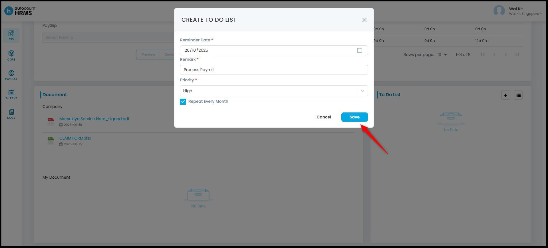 The ESS (Employee Self-Service) dashboard allows employees to create and manage their personal To-Do List, helping them stay organised and keep track of important tasks. In addition to managing to-dos, employees can also access their payslips and view their leave information.
