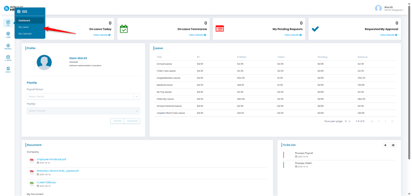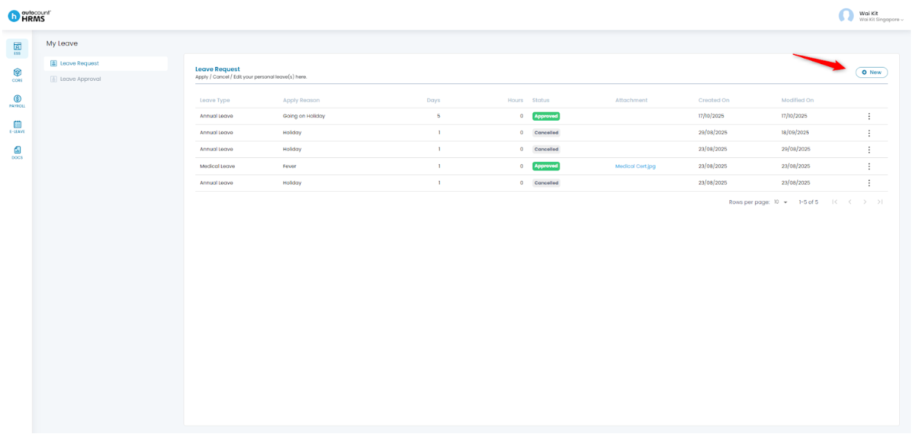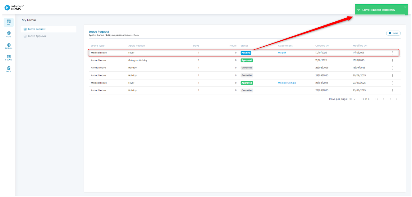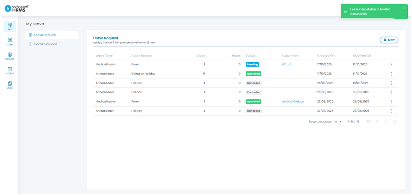 The HRMS Leave Request feature enables employees to submit, edit, or cancel their personal leave applications easily, ensuring accurate tracking of leave balances and approvals.