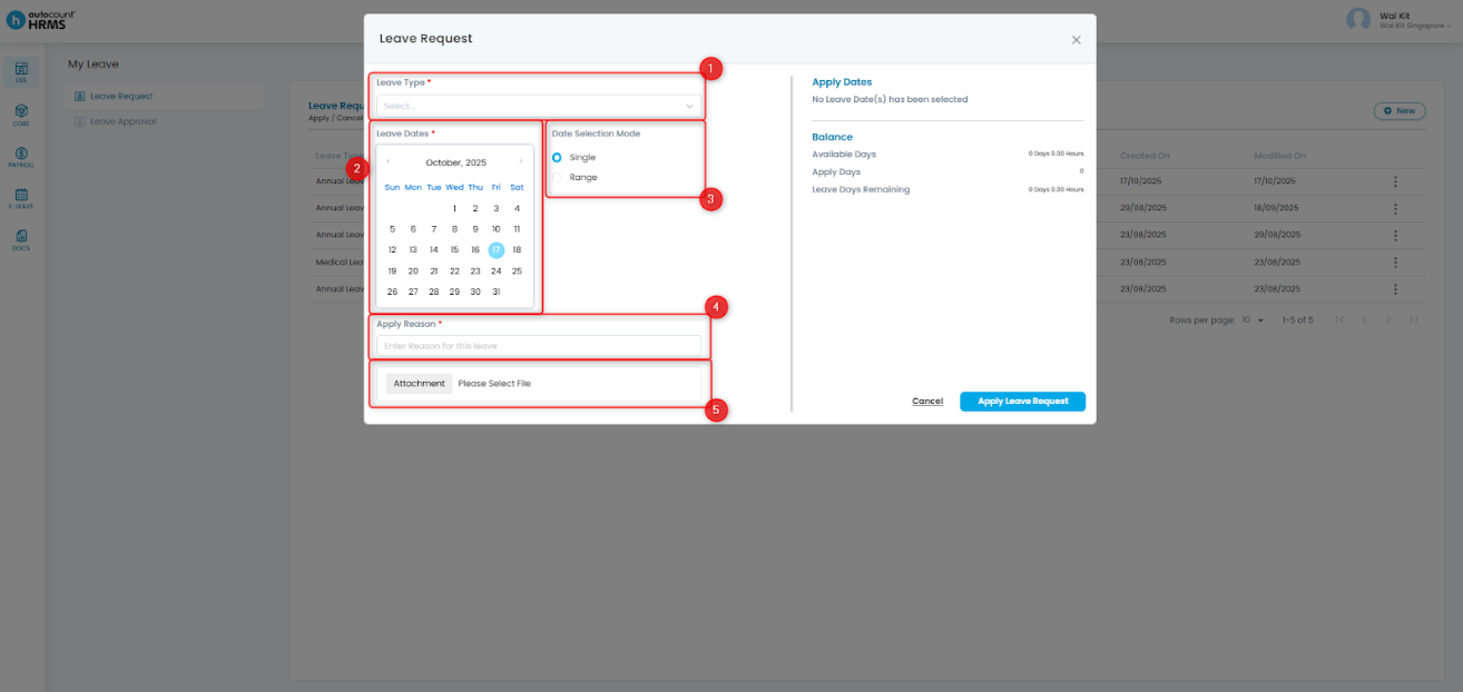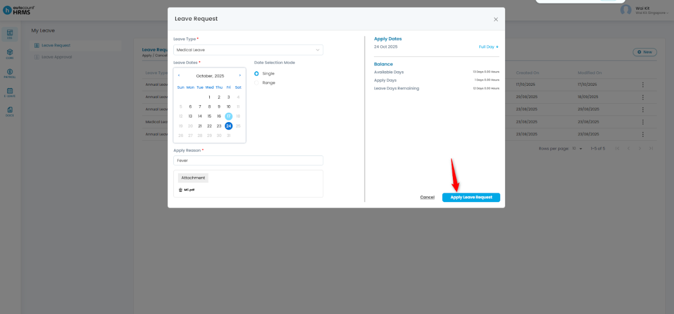4. Review your Apply Dates and ensure sufficient balance. Click Apply Leave Request to submit.