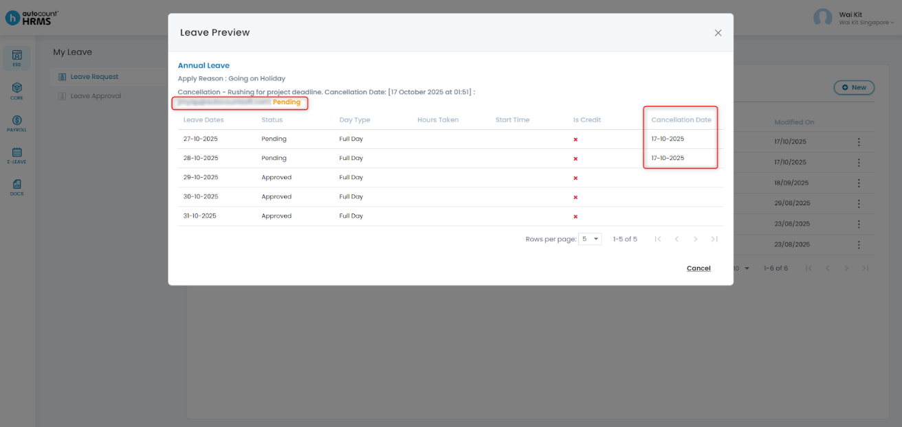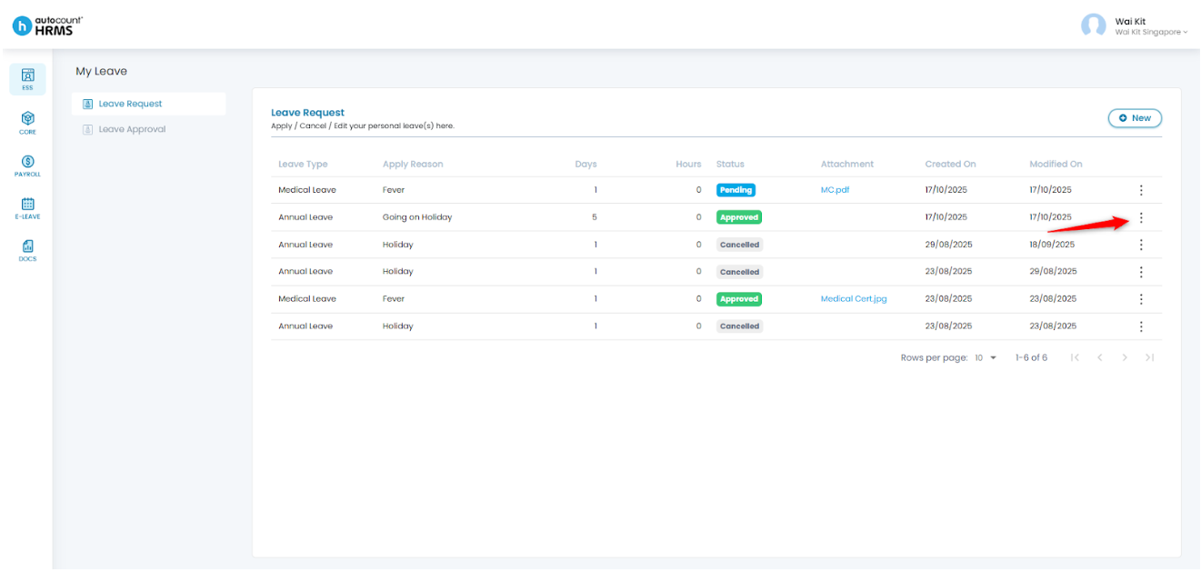 2. Click the three-dot icon at the end of the leave request you want to cancel.