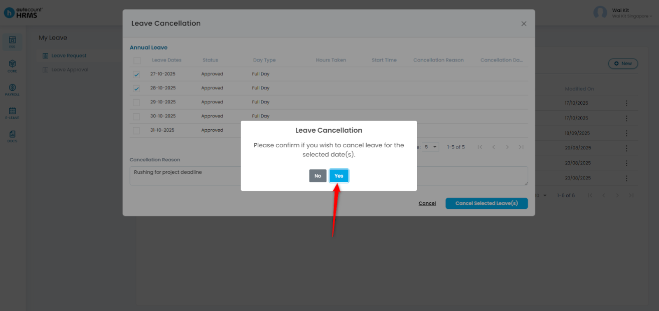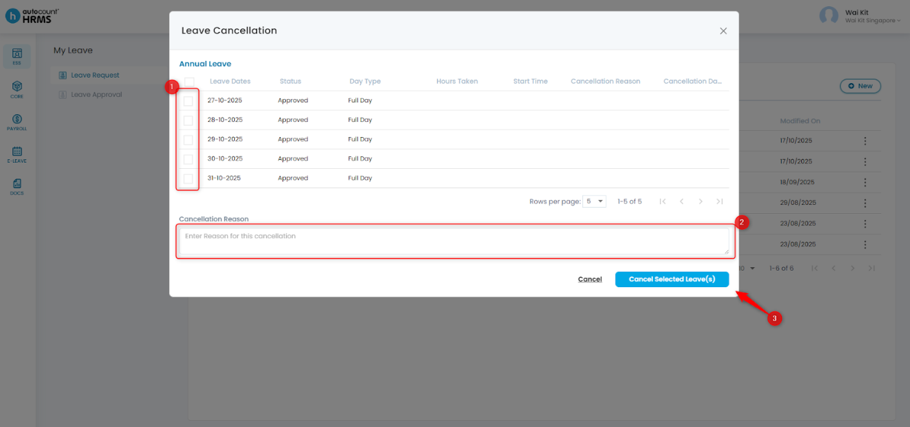 3. Select the leave date(s) to cancel, enter the Cancellation Reason, review the selection, and click Cancel Selected Leave(s).