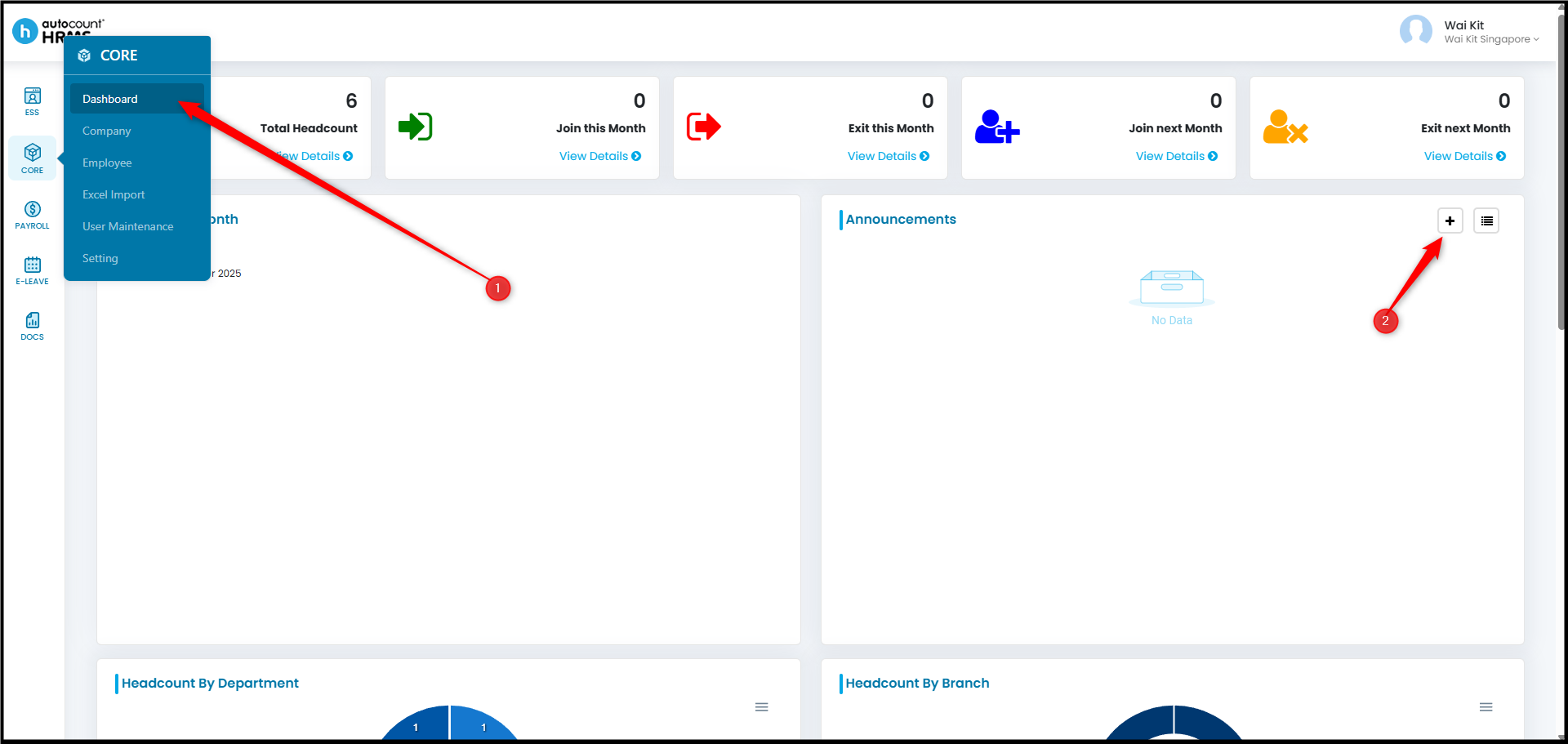 - To create a new announcement, go to Core > Dashboard. Locate Announcements and click the plus (+) icon to add a new announcement.