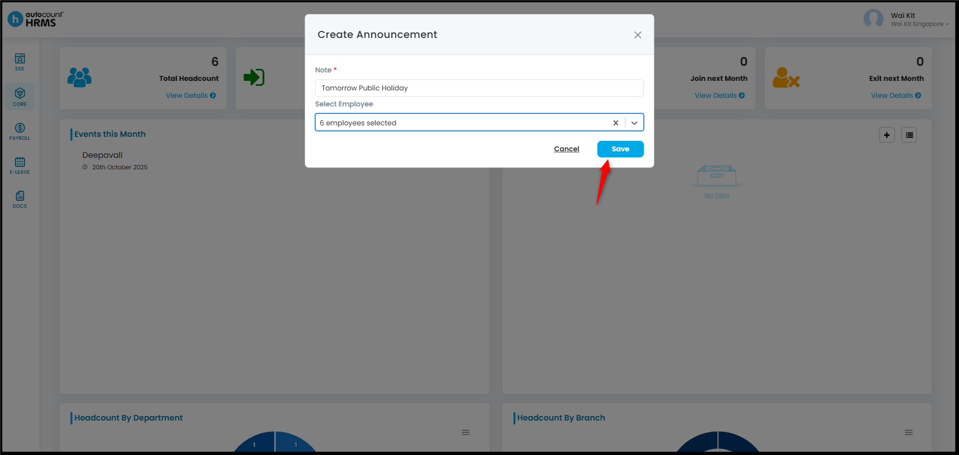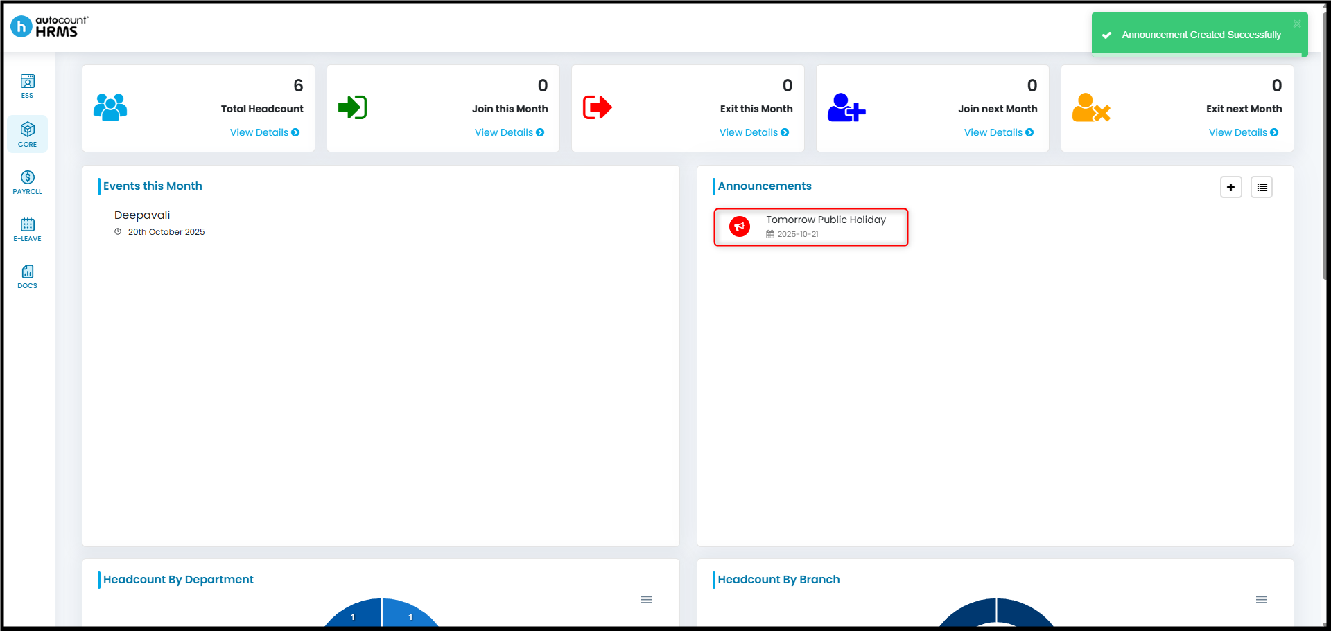 Employers can make announcements to staff about upcoming company activities or notices — such as the annual company trip, training sessions, or additional public holidays — through HRMS.