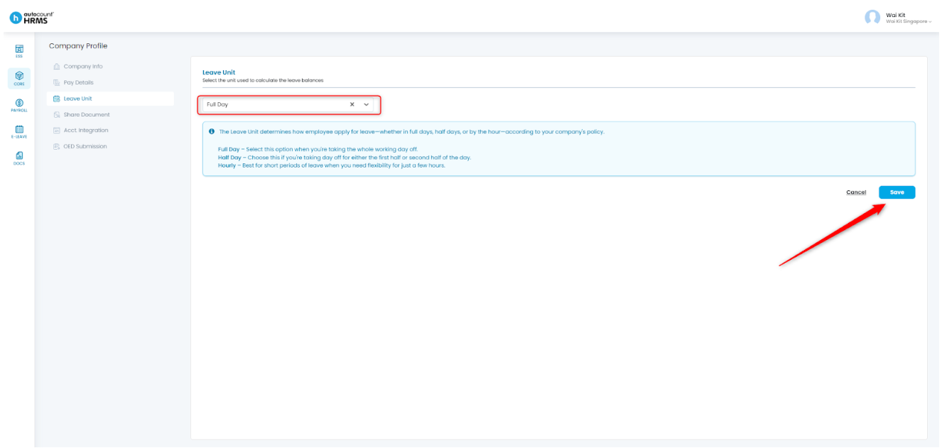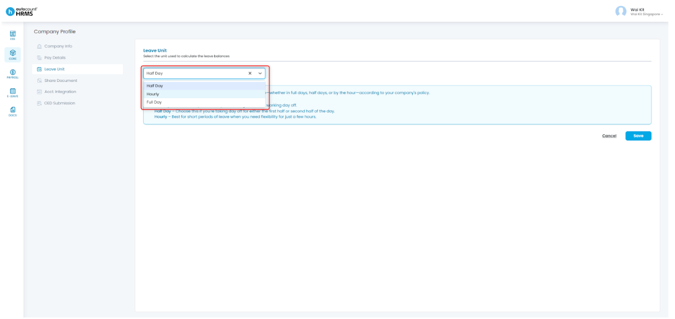 The Leave Unit determines how employees apply for leave—whether in full days, half days, or by the hour—based on the company’s leave policy. Configuring the correct leave unit ensures accurate leave application and balance calculations.