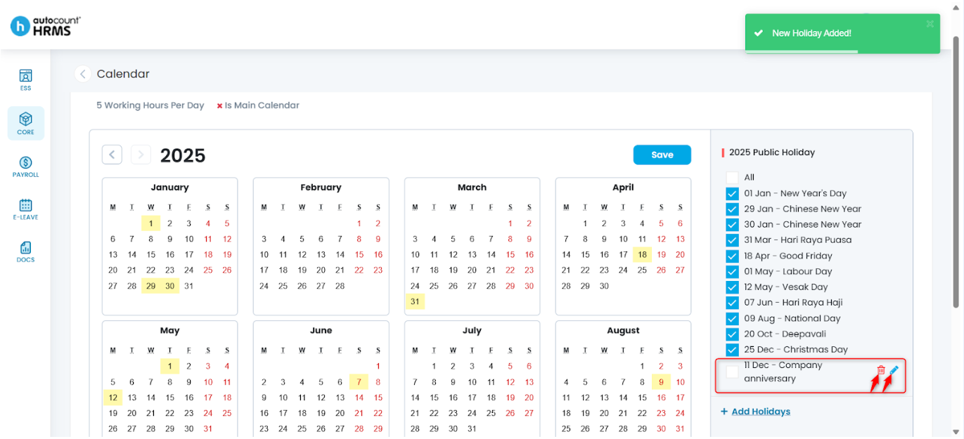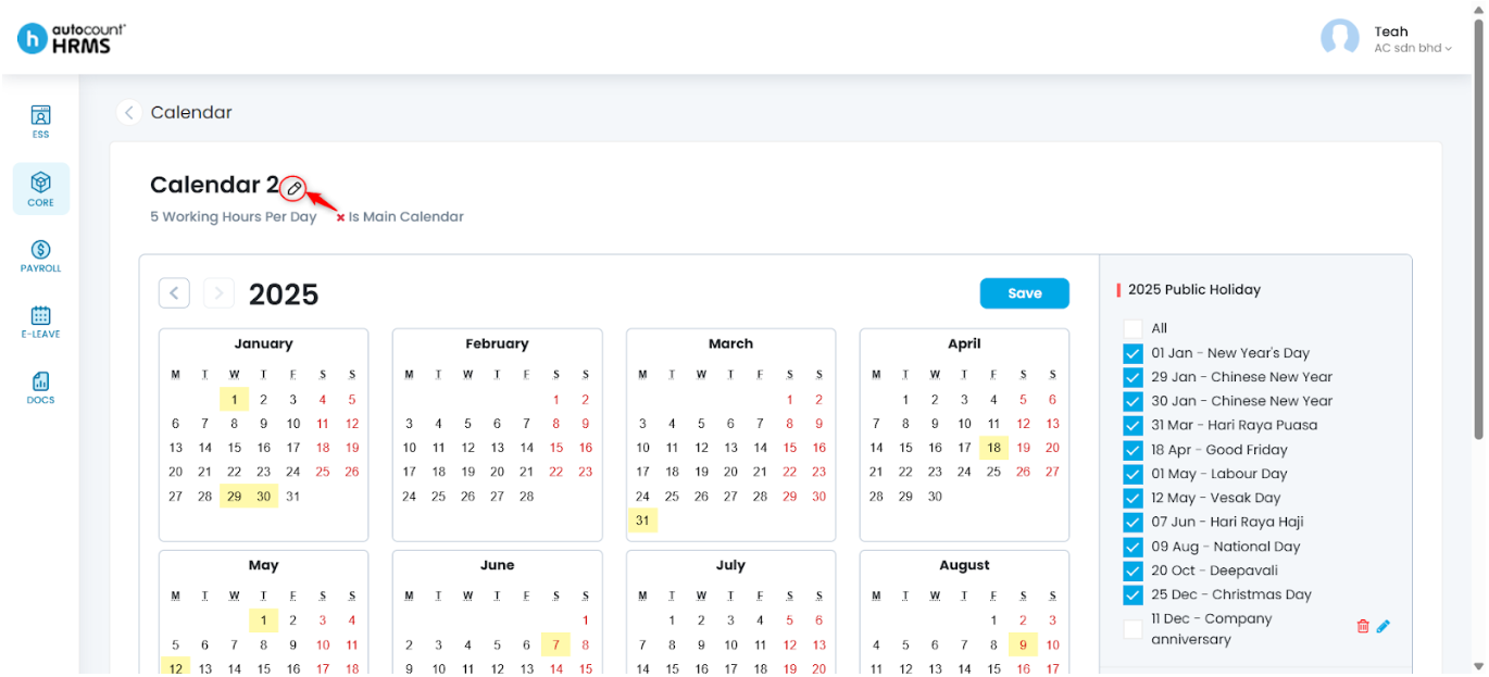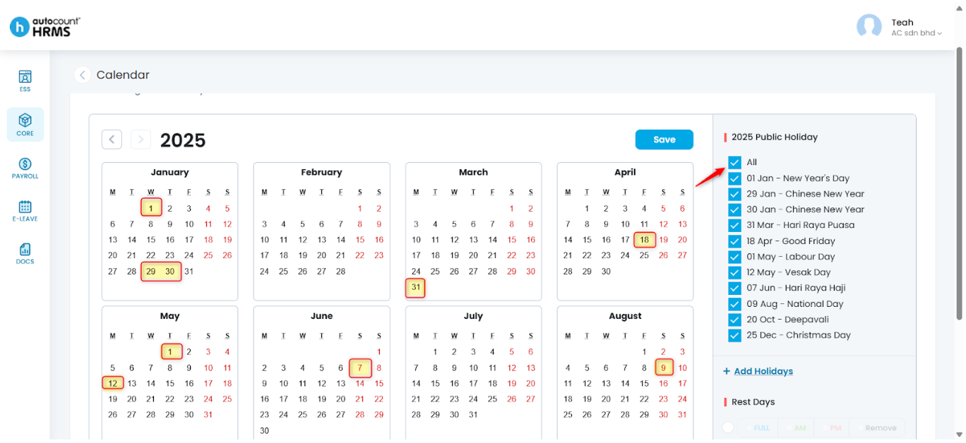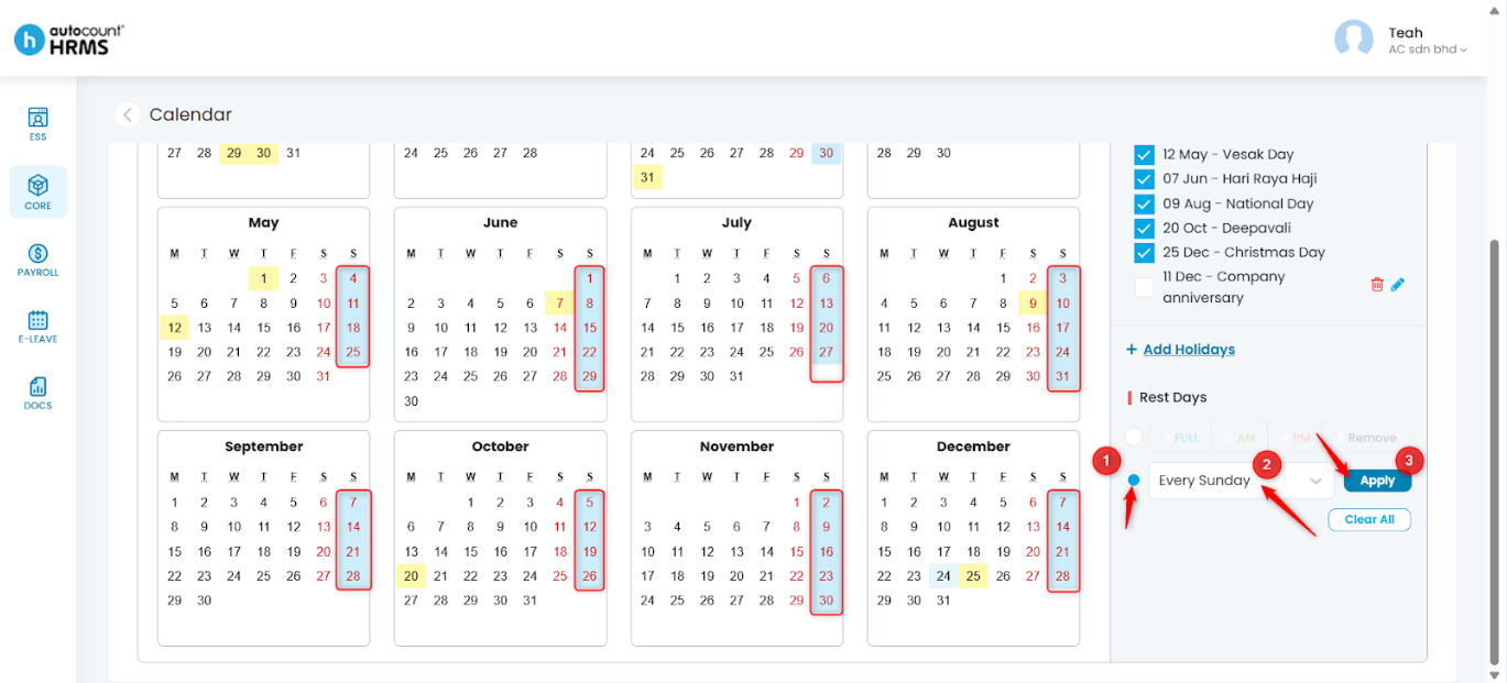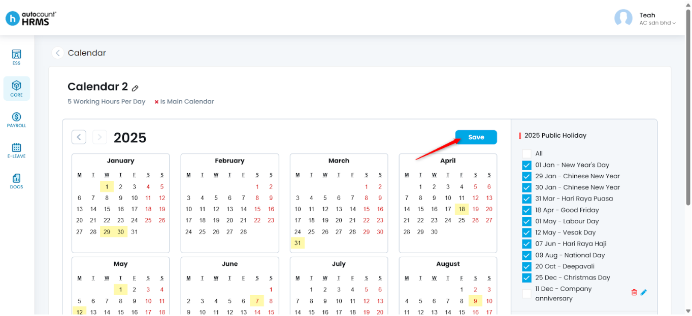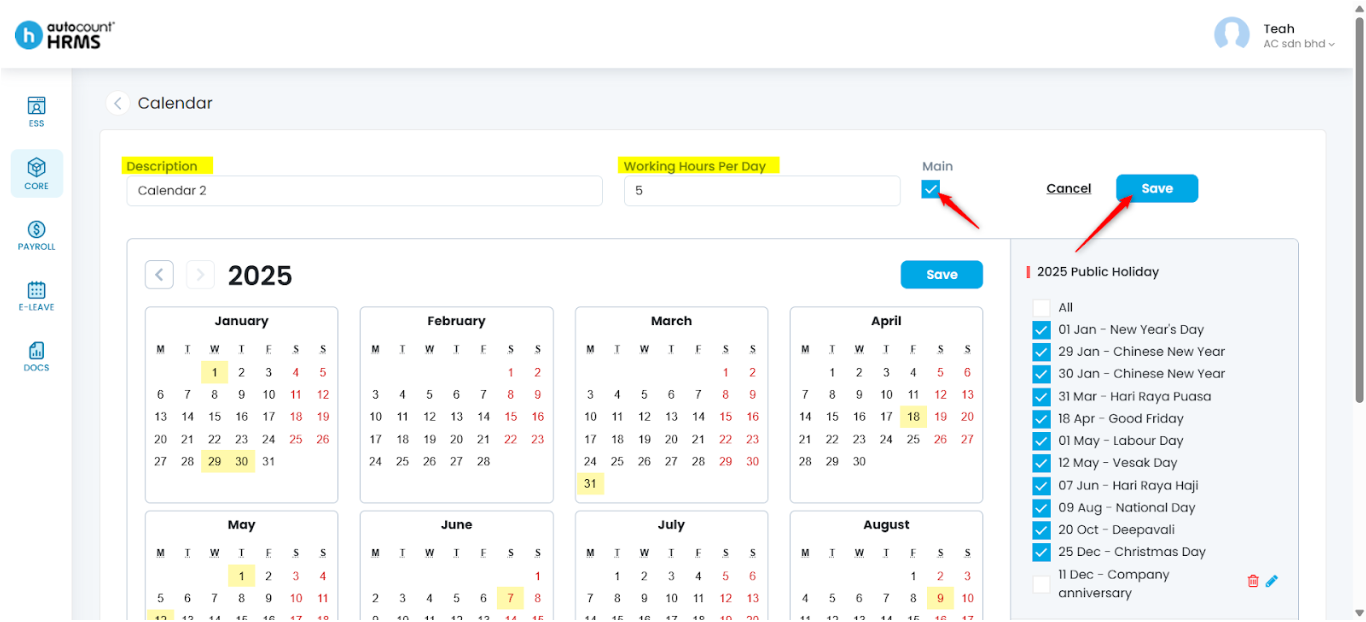 The Calendar feature allows employers to define working days, rest days, and public holidays, and assign them to employees. A properly configured work calendar provides clear visibility of work schedules, supports accurate attendance and payroll calculations, and serves as a reference for leave and overtime management.