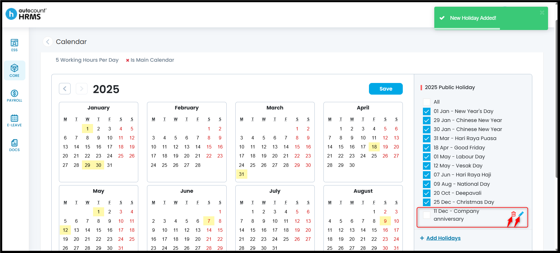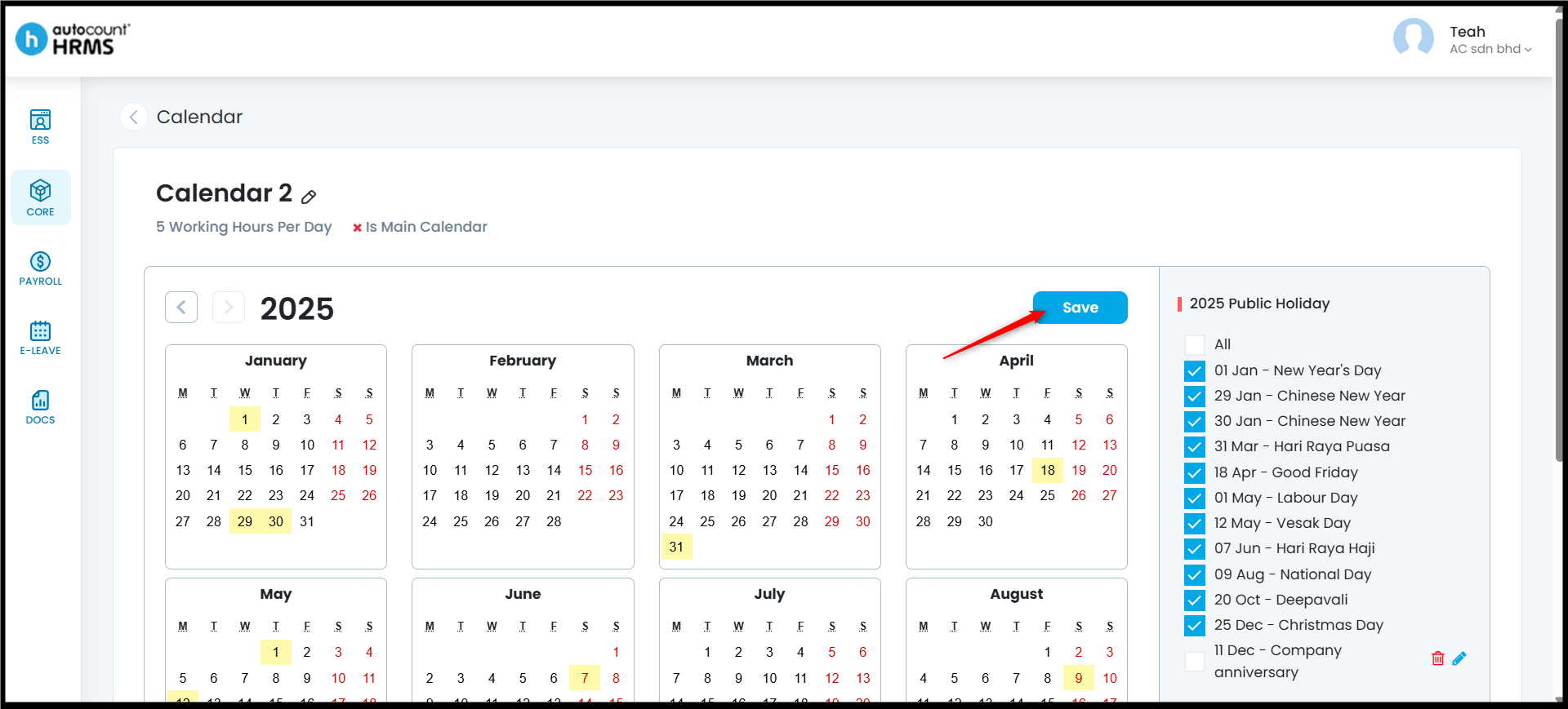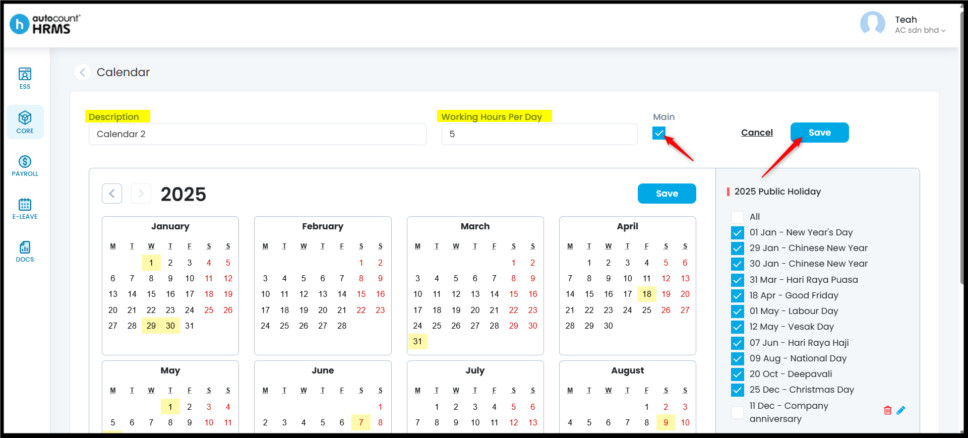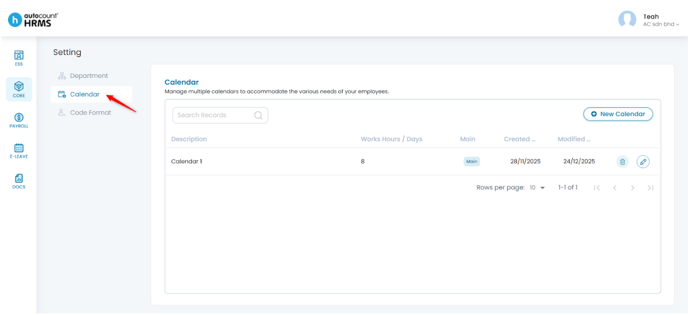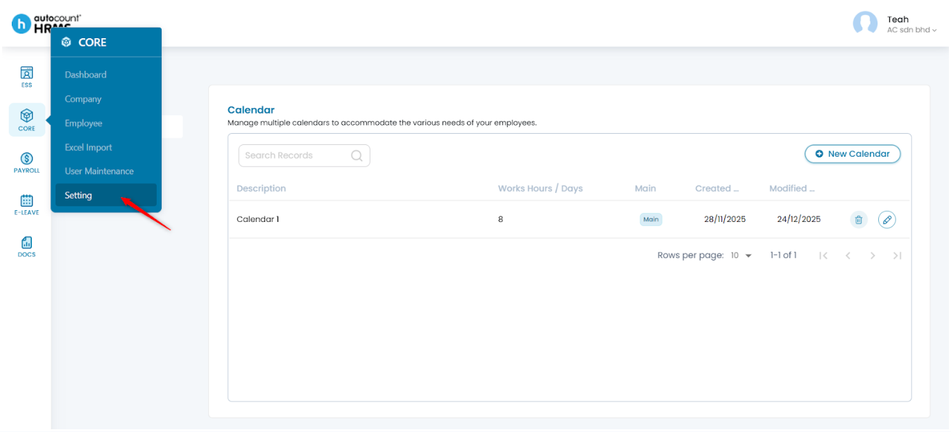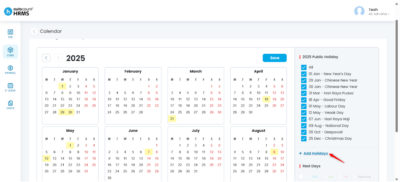The Calendar feature allows employers to define working days, rest days, and public holidays, and assign them to employees. A properly configured work calendar provides clear visibility of work schedules, supports accurate attendance and payroll calculations, and serves as a reference for leave and overtime management.