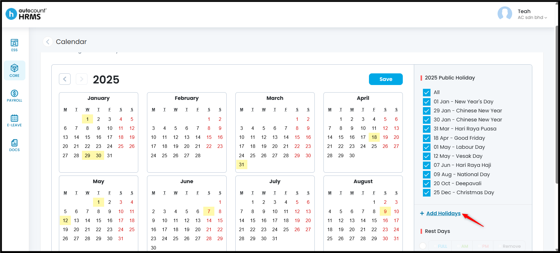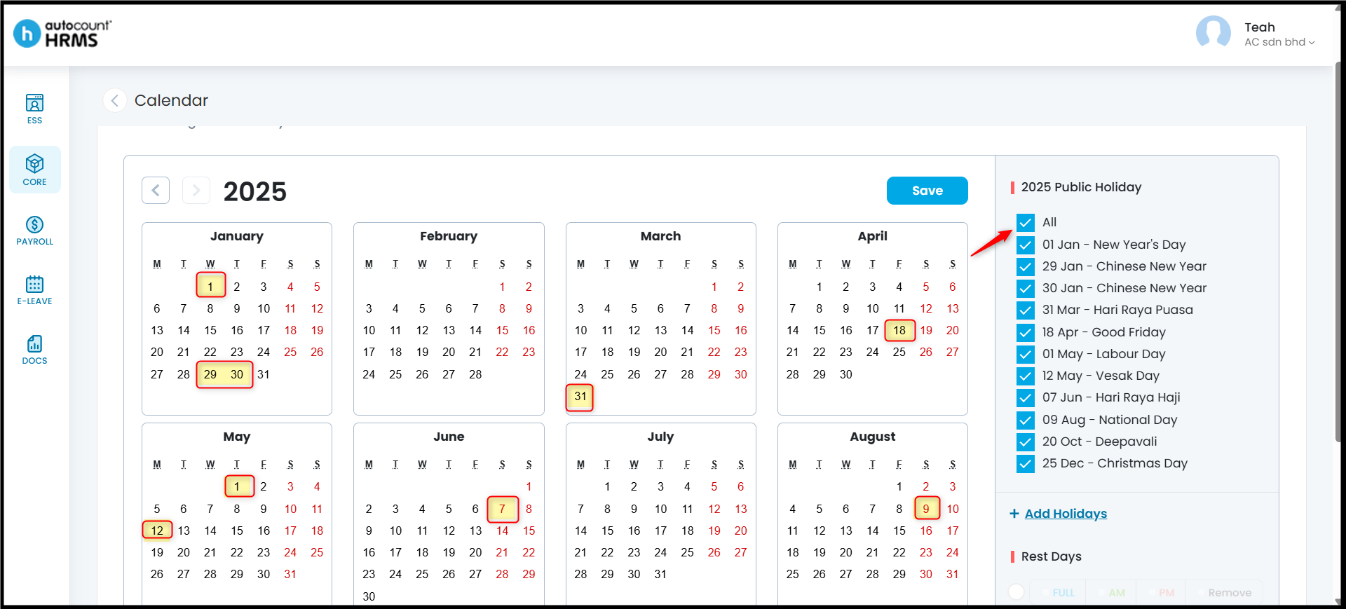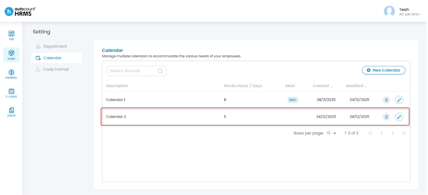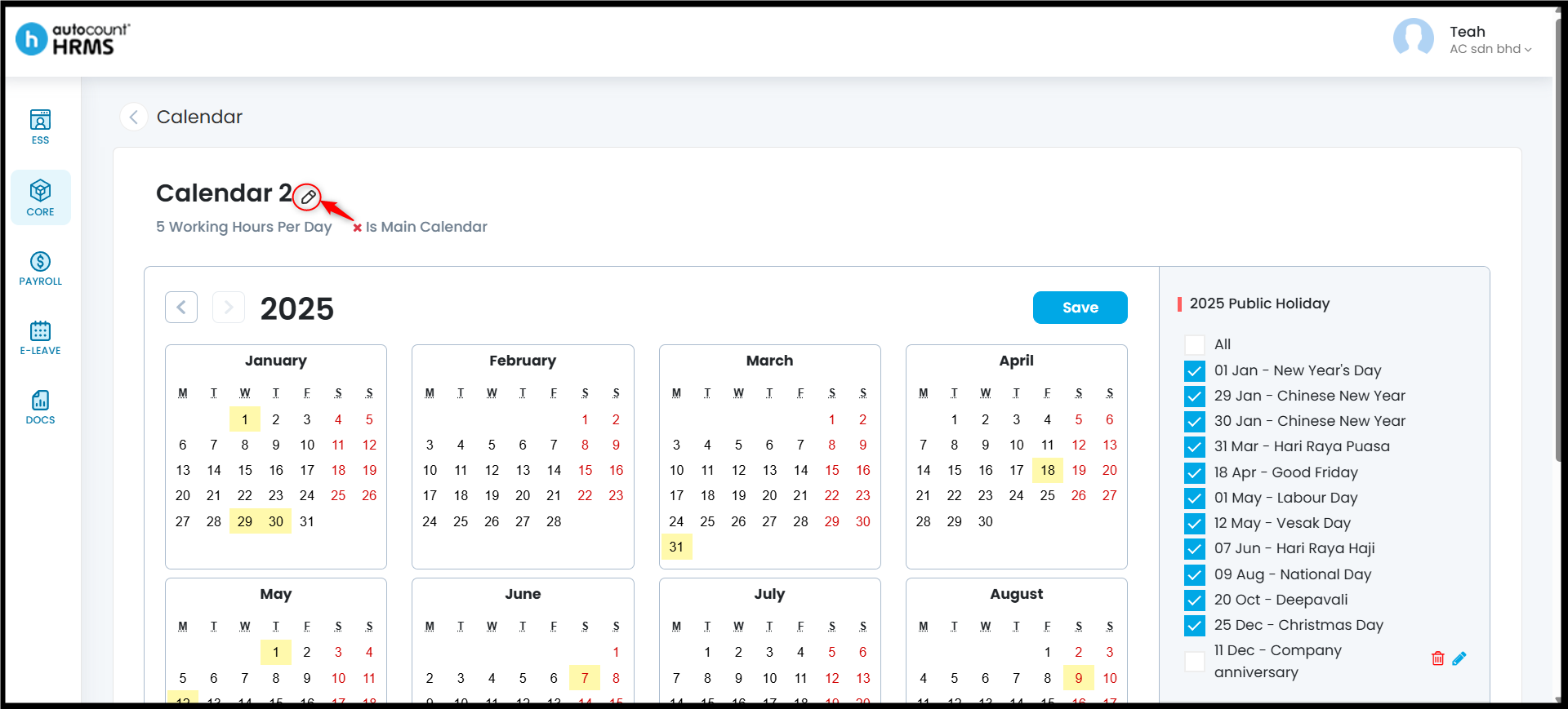 The Calendar feature allows employers to define working days, rest days, and public holidays, and assign them to employees. A properly configured work calendar provides clear visibility of work schedules, supports accurate attendance and payroll calculations, and serves as a reference for leave and overtime management.