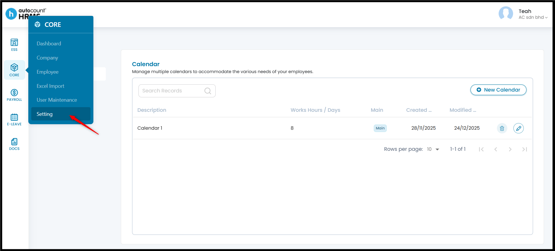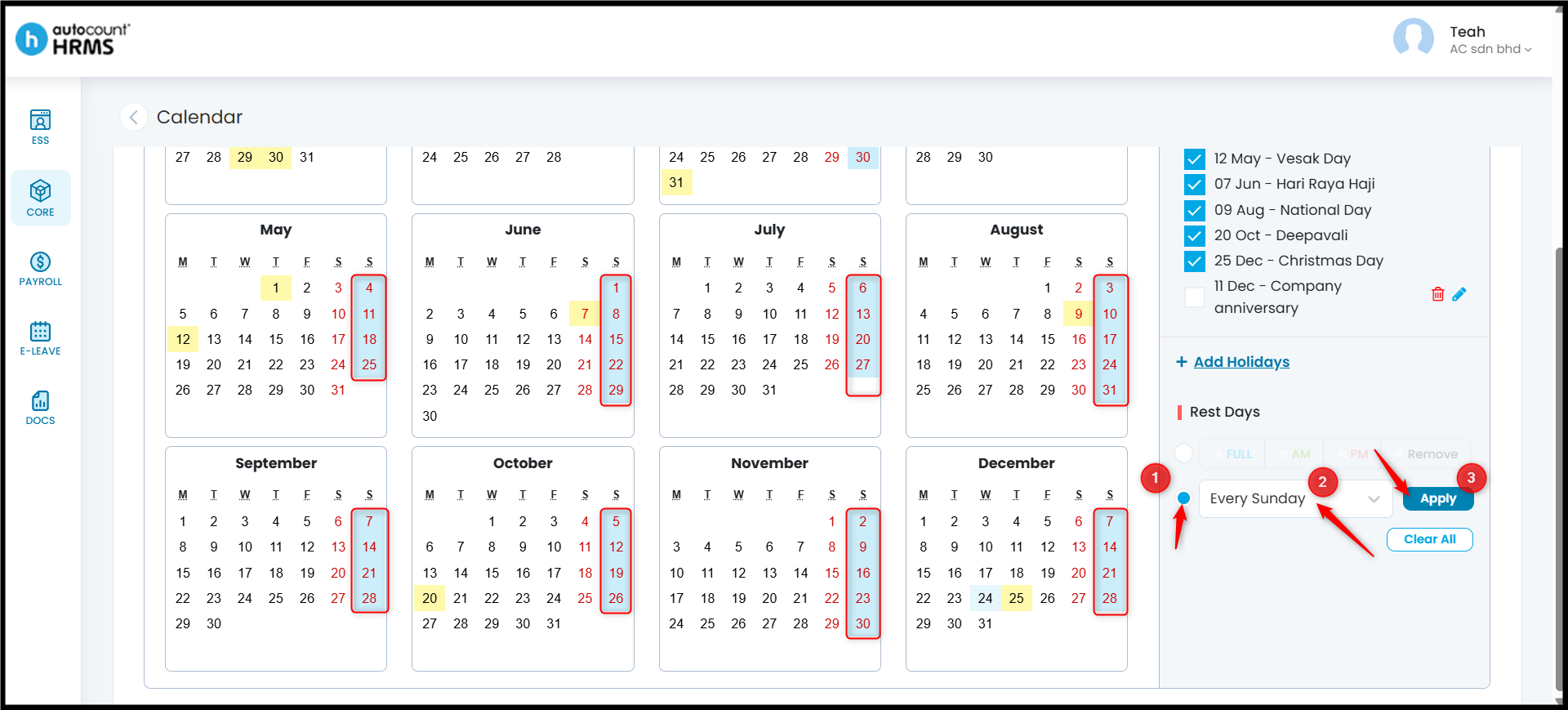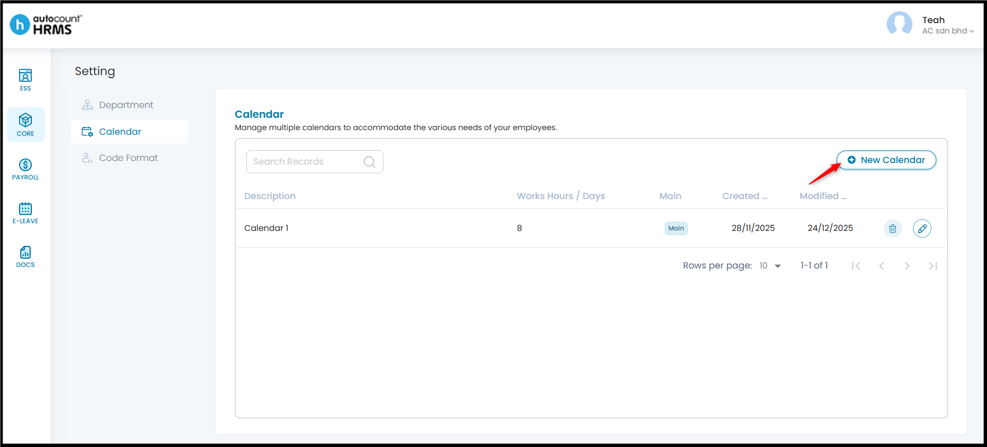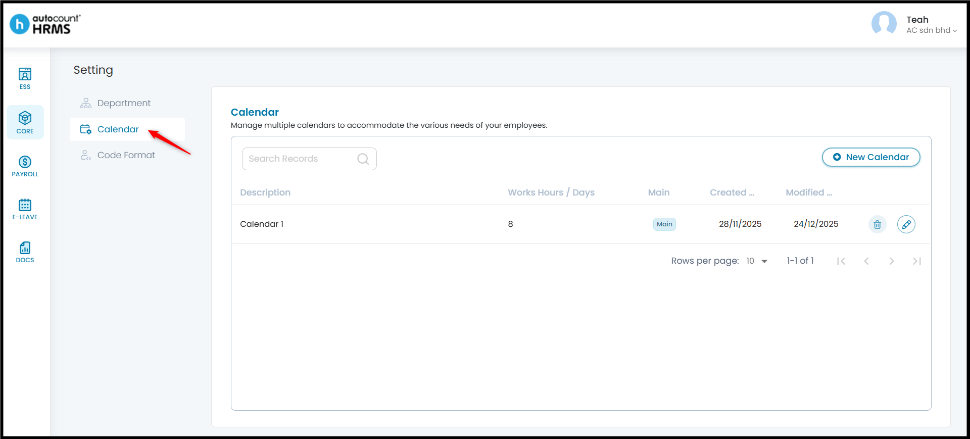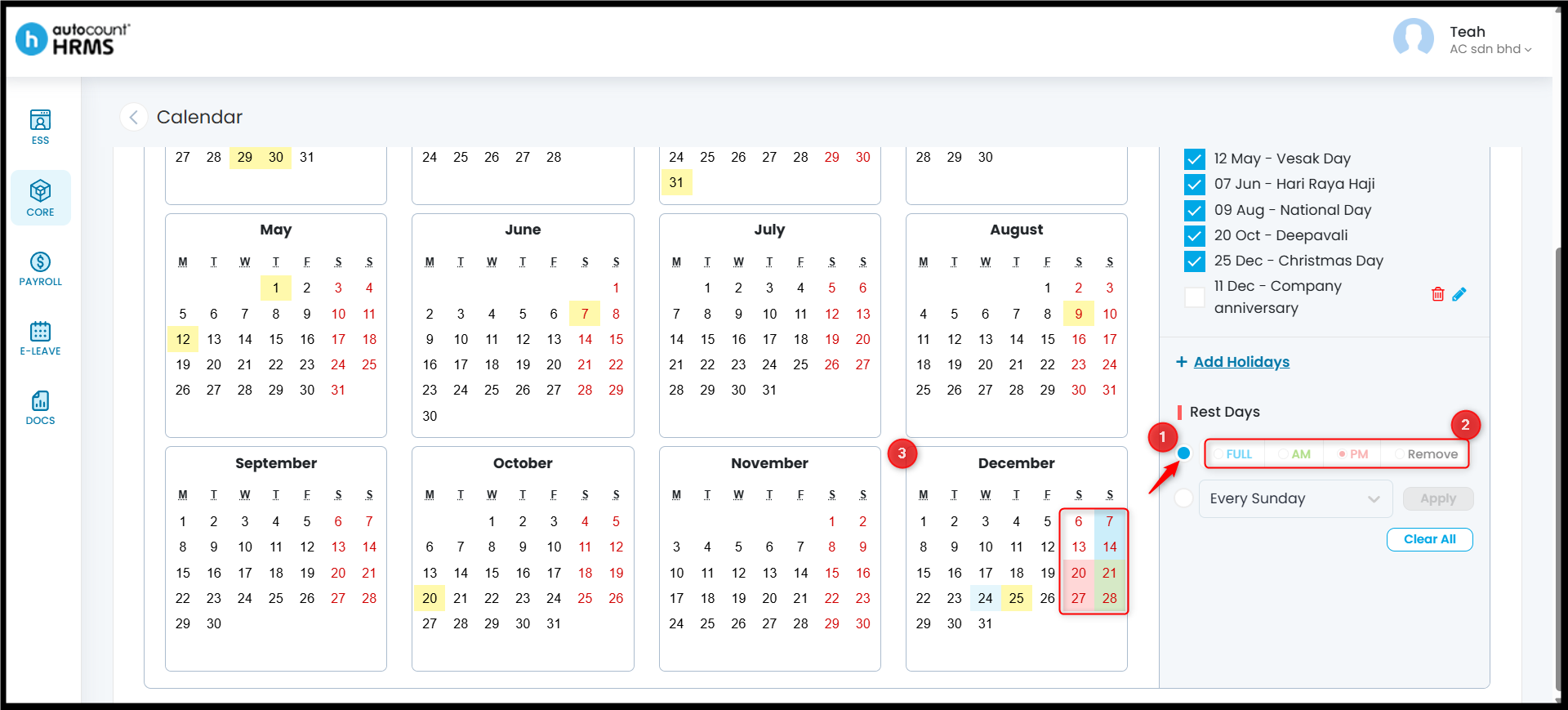The Calendar feature allows employers to define working days, rest days, and public holidays, and assign them to employees. A properly configured work calendar provides clear visibility of work schedules, supports accurate attendance and payroll calculations, and serves as a reference for leave and overtime management.