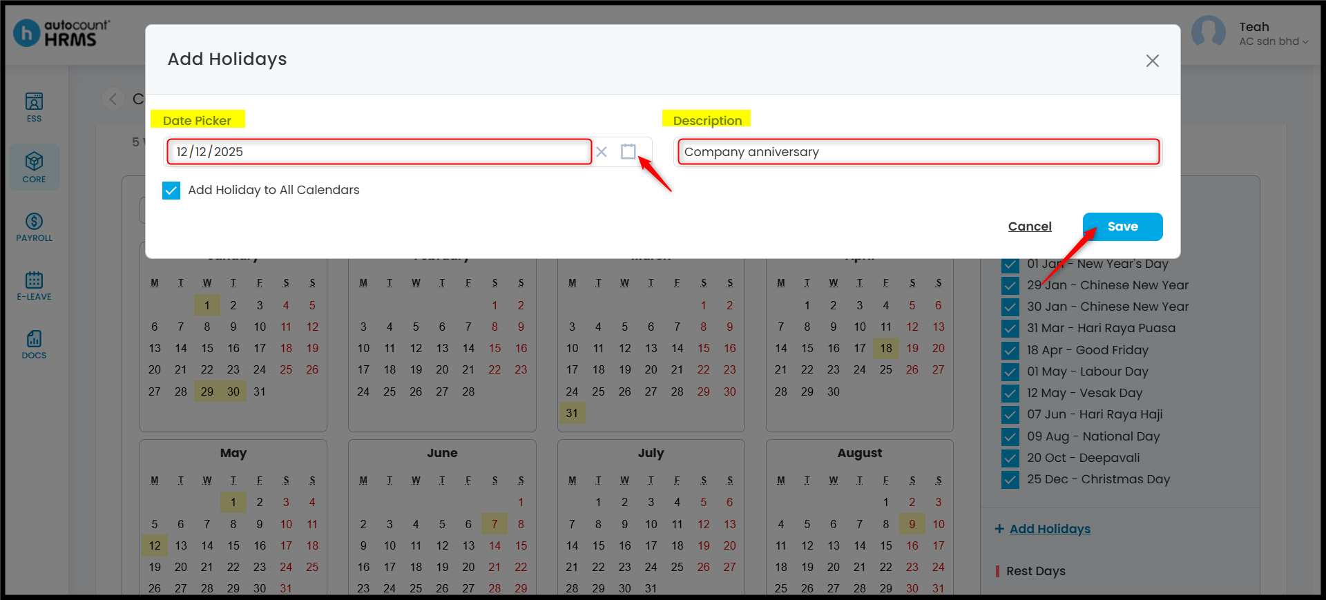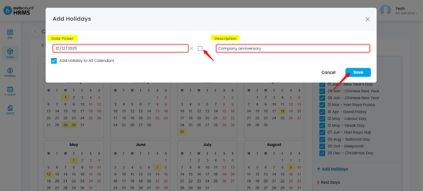 - Add Holiday to All Calendars – Tick to apply the holiday across all work calendars if applicable.