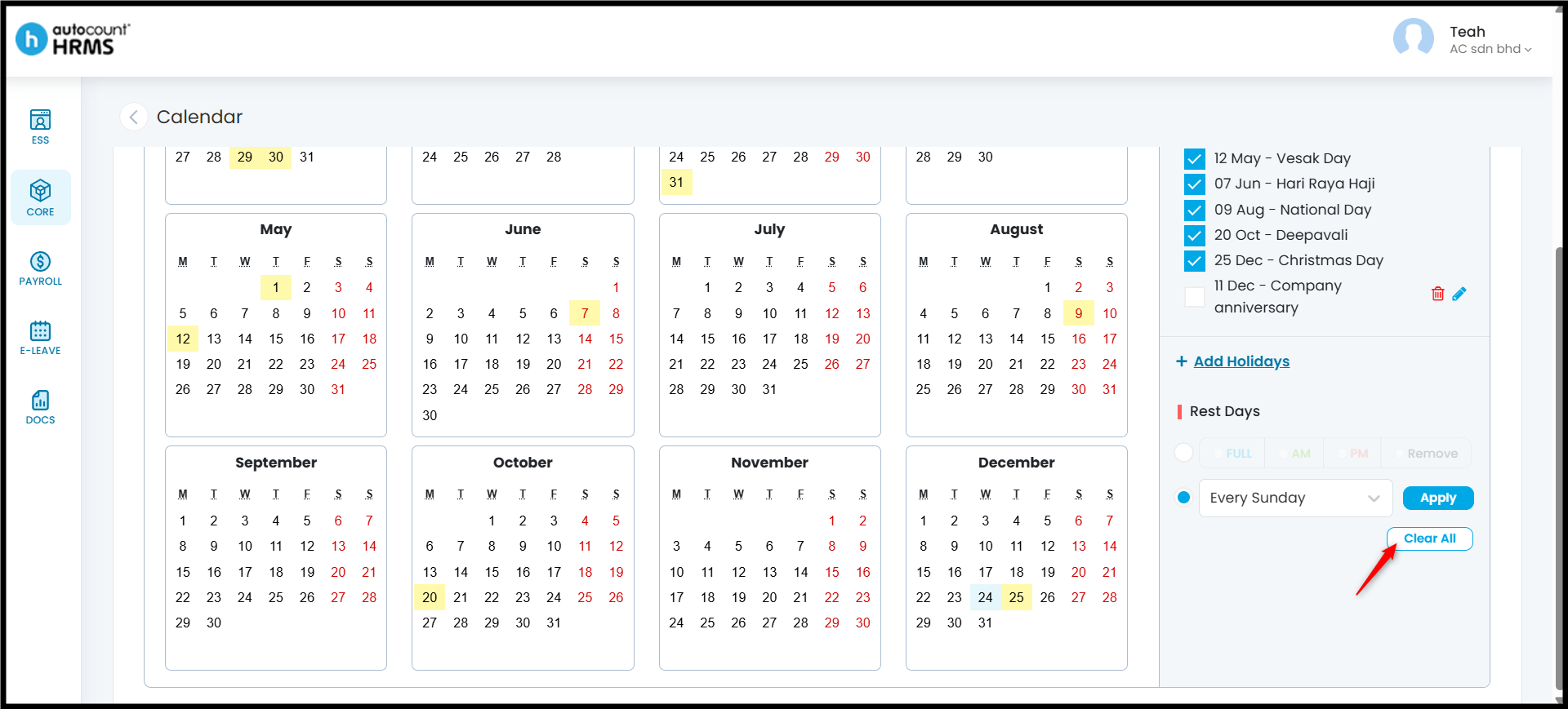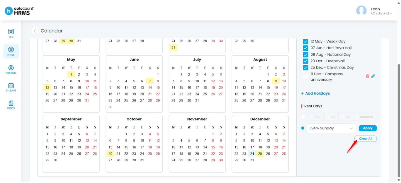 - Clear All Rest Days – Click Clear All to remove all applied rest day settings.