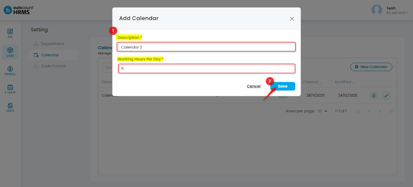 4. Enter the Calendar Description and Working Hours per Day. Click Save.