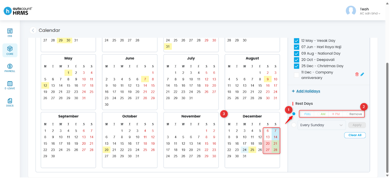 iii. Click the dates on the calendar to apply rest days accordingly.