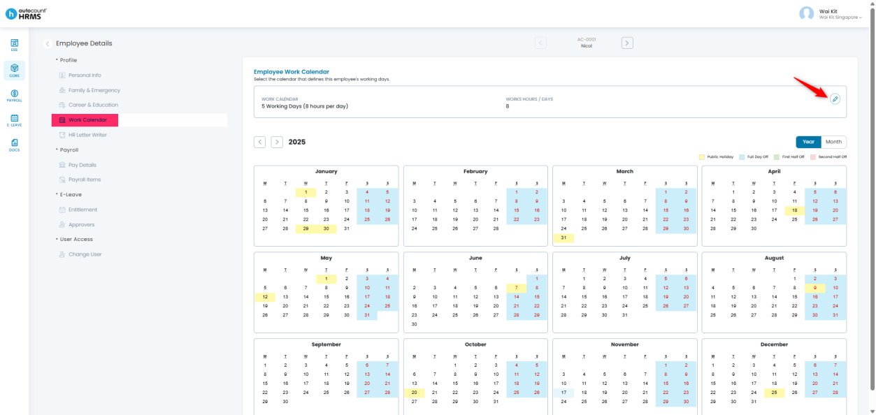 4. Go to the Work Calendar section and click the pencil icon to edit.