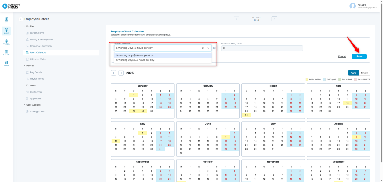 The Work Calendar helps HRMS determine an employee’s working days, rest days, public holidays, and daily working hours. Maintaining the correct Work Calendar in each employee’s profile is essential, as it ensures accurate overtime calculations— especially when employees work on rest days or public holidays.