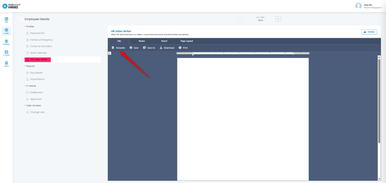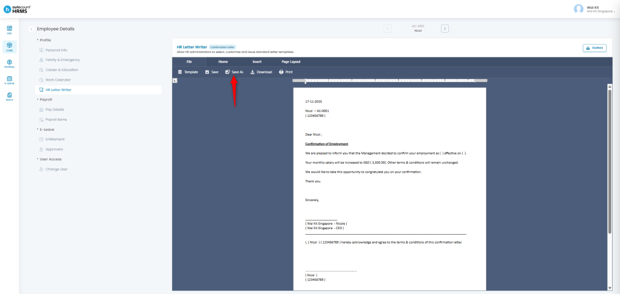 The HR Letter Writer allows HR users to generate, customise, and send official letters to employees directly through HRMS. It will also be kept within the employee's profile once it has been acknowledged by the employee themselves.